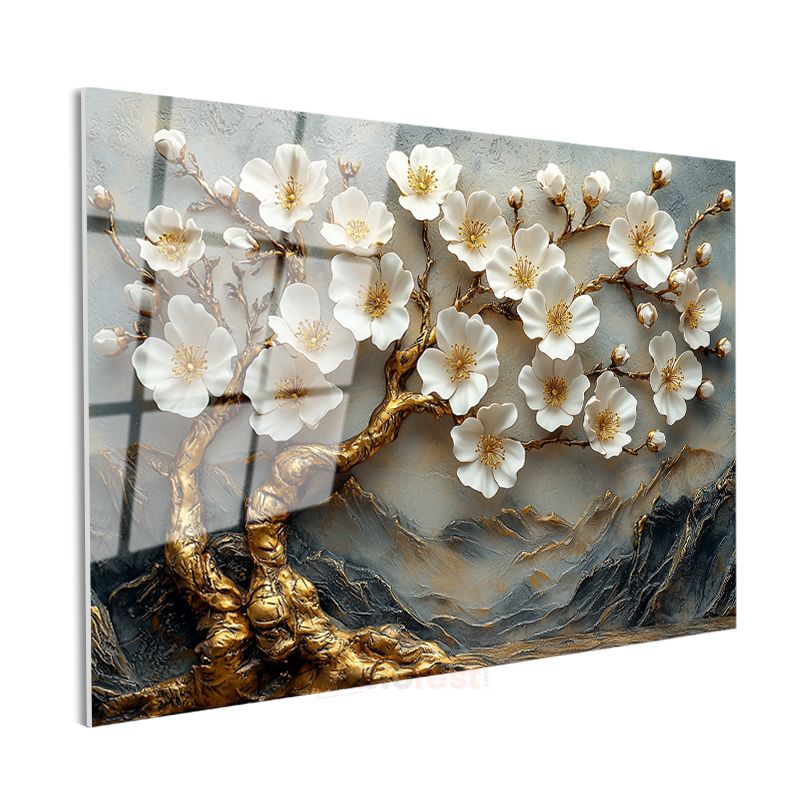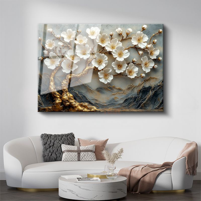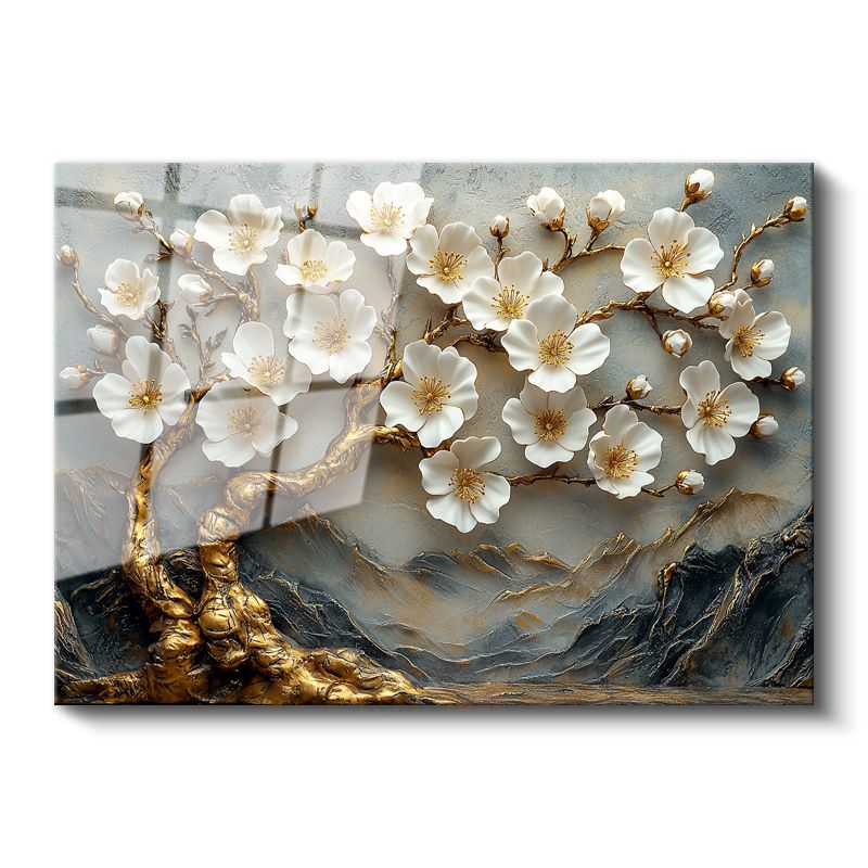Beyaz Çiçekli Ağaç - Altın Gövdeli Kabartma Görünümlü Cam Tablo