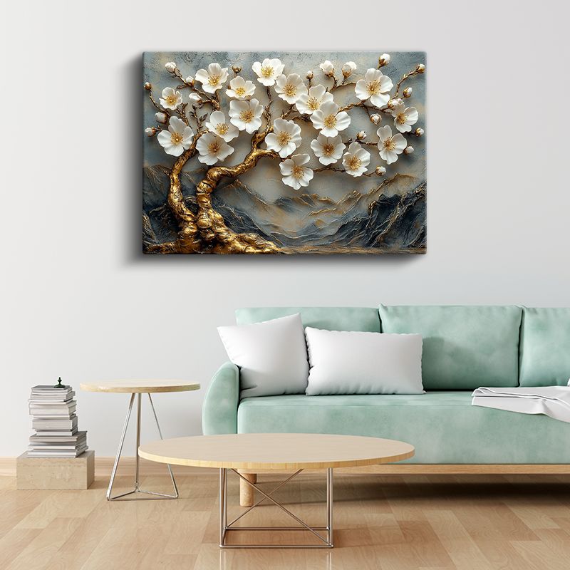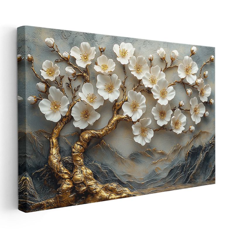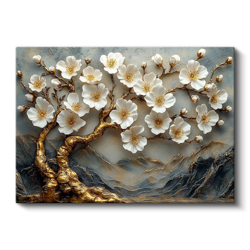 Beyaz Çiçekli Ağaç - Altın Gövdeli Kabartma Görünümlü Kanvas Tablo
