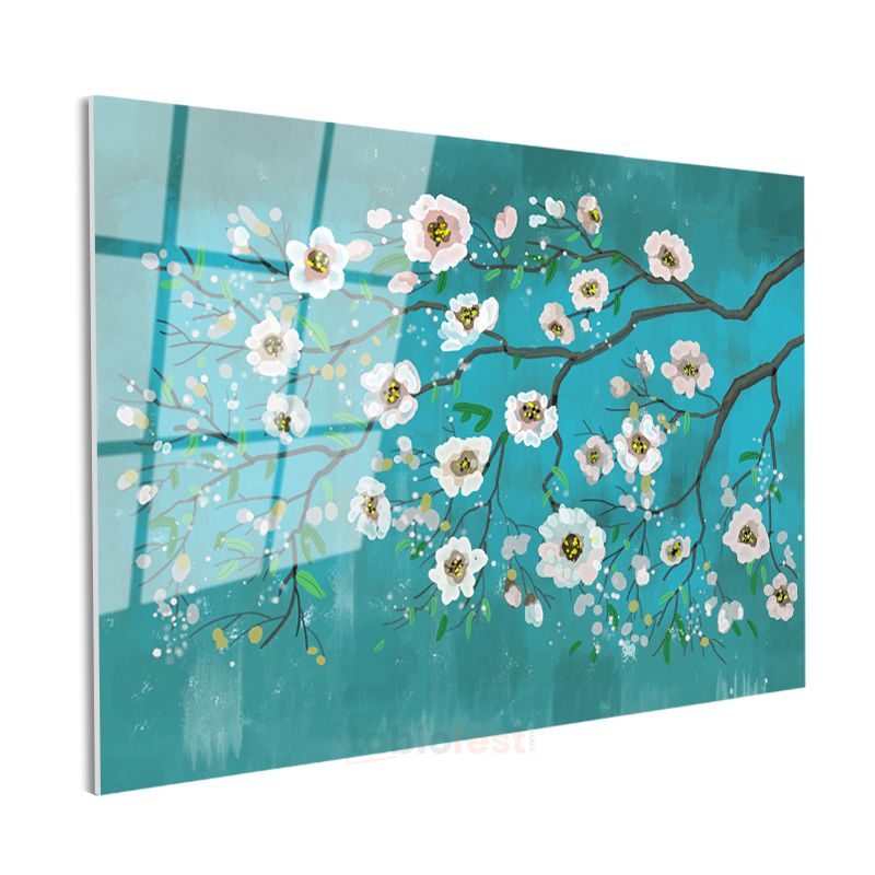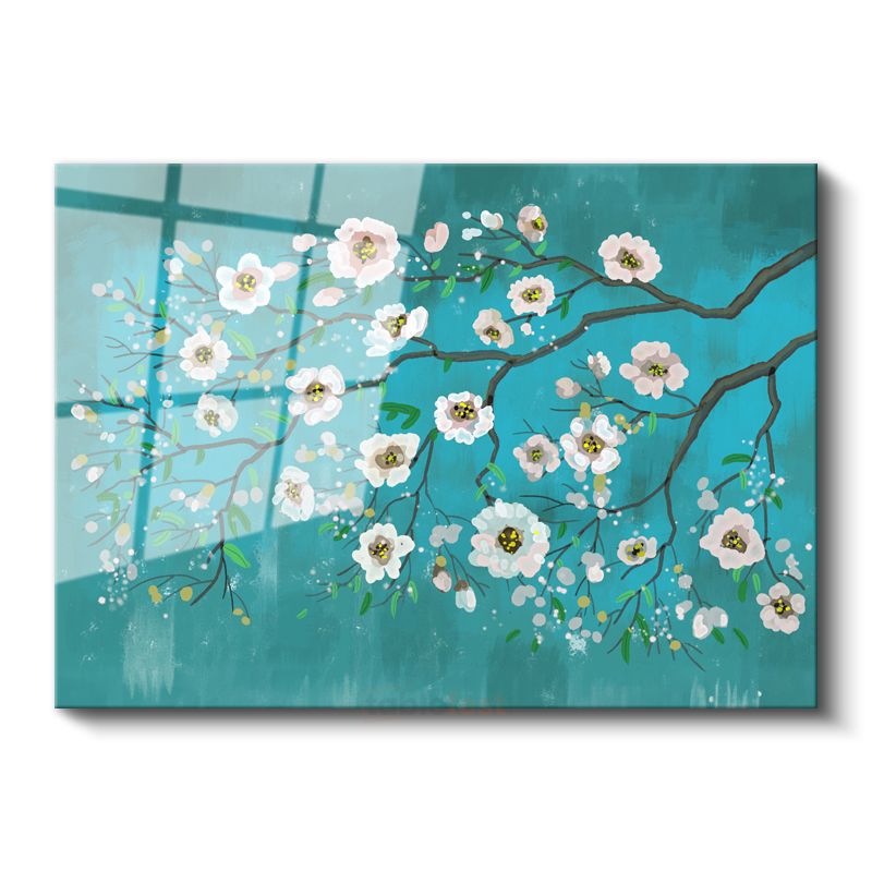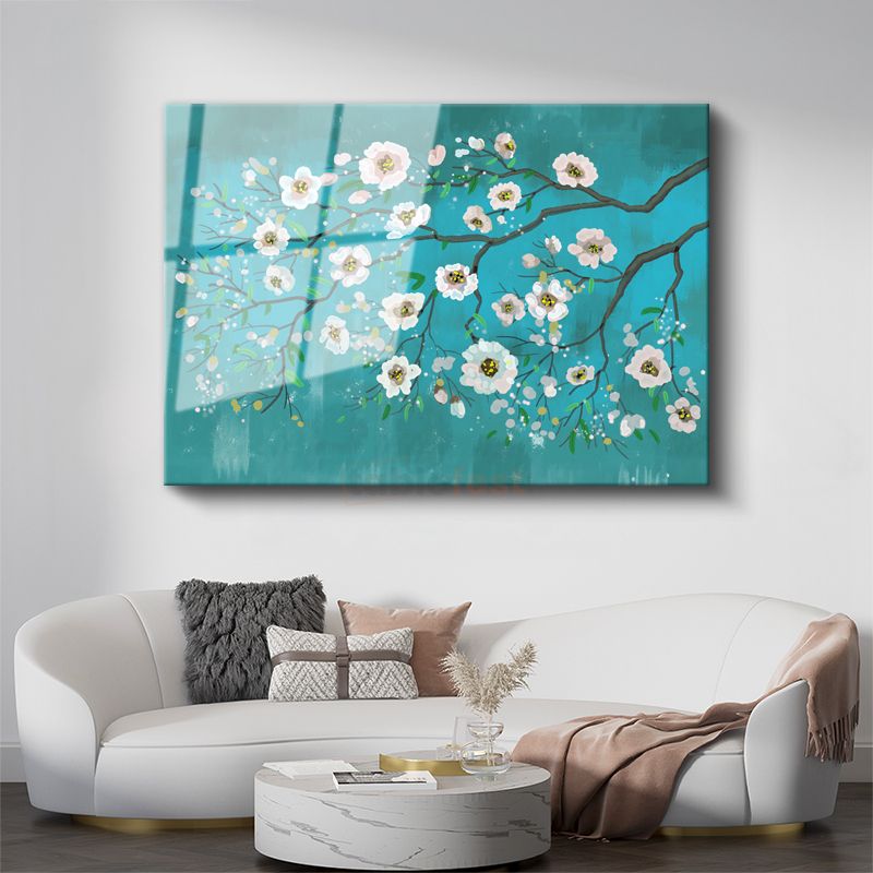 Beyaz Çiçekli Dal - Turkuaz Fonda Japon Tarzı Tasarım Cam Tablo