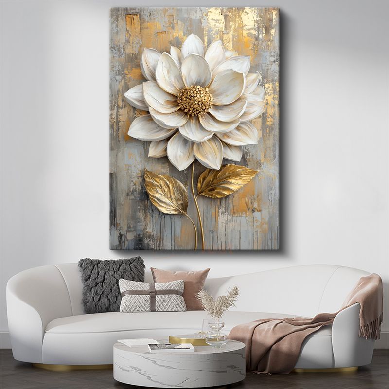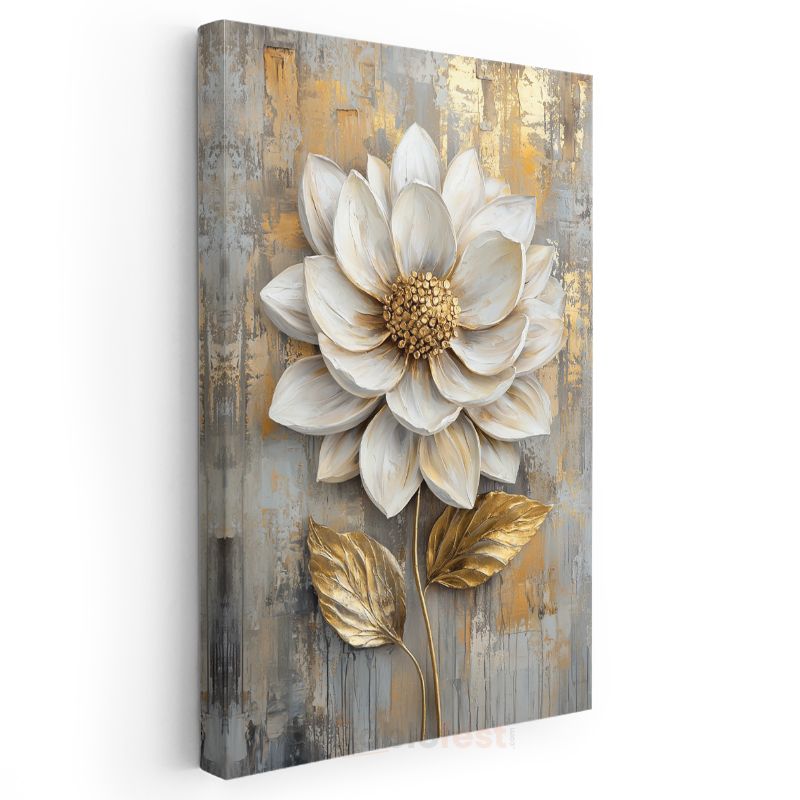 Beyaz Dahlia - Altın Detaylı Tekstürlü Çiçek Kanvas Tablo