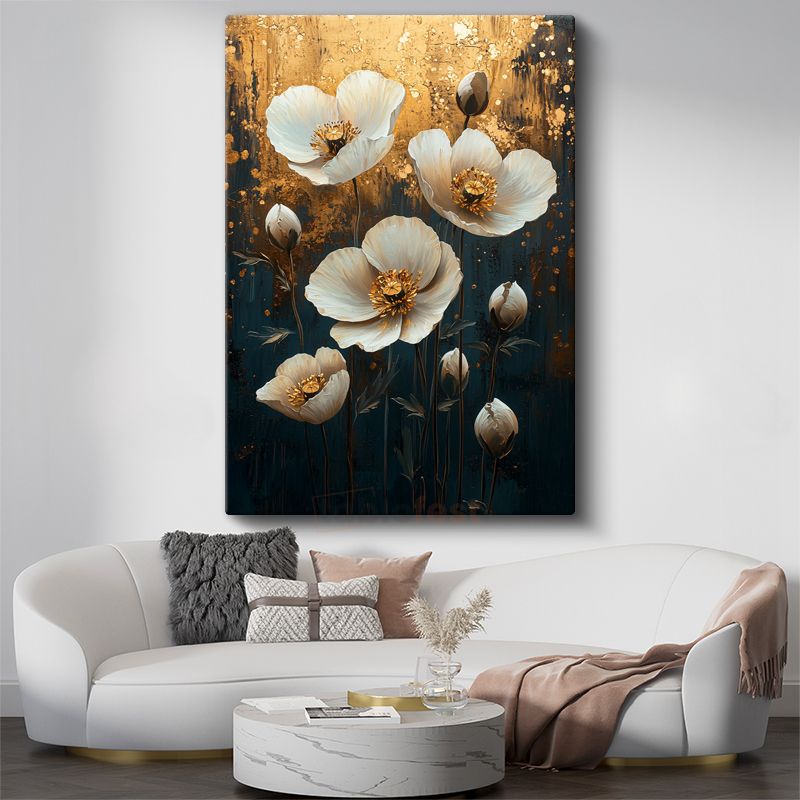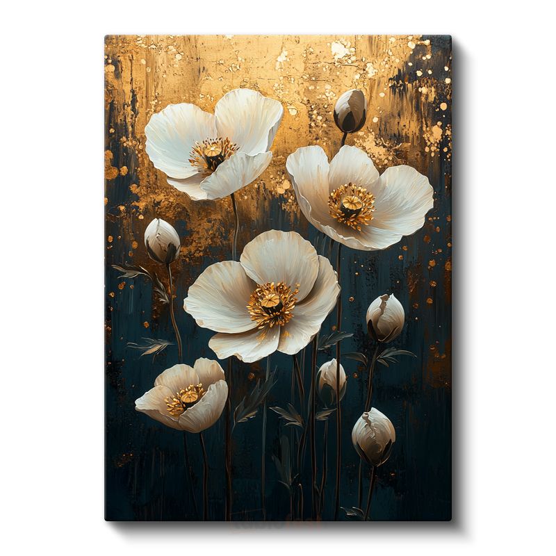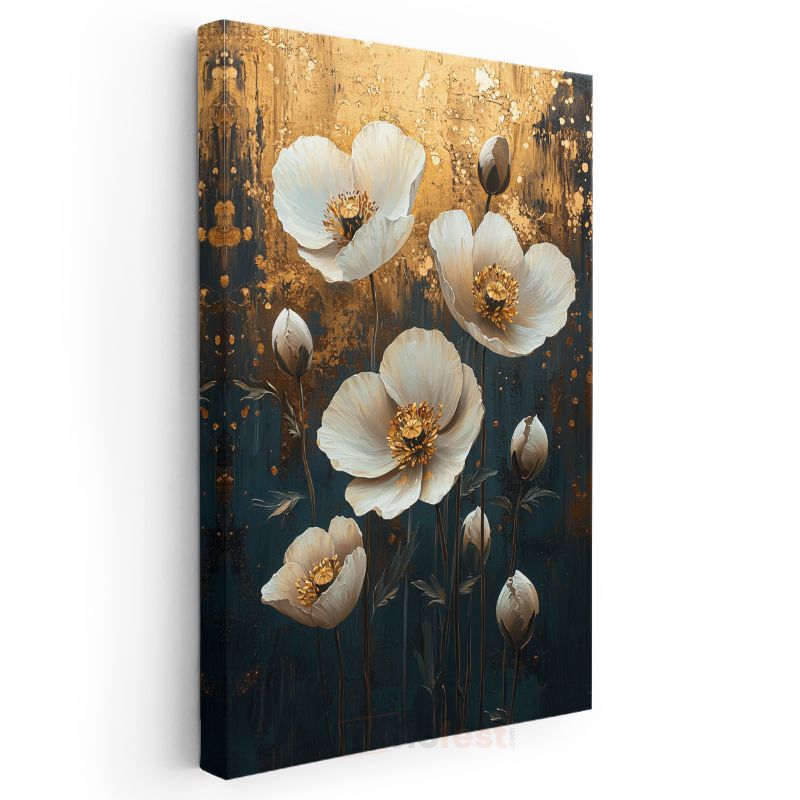 Beyaz Gelincikler - Altın Zemin Üzerinde Zarif Çiçekler Kanvas Tablo