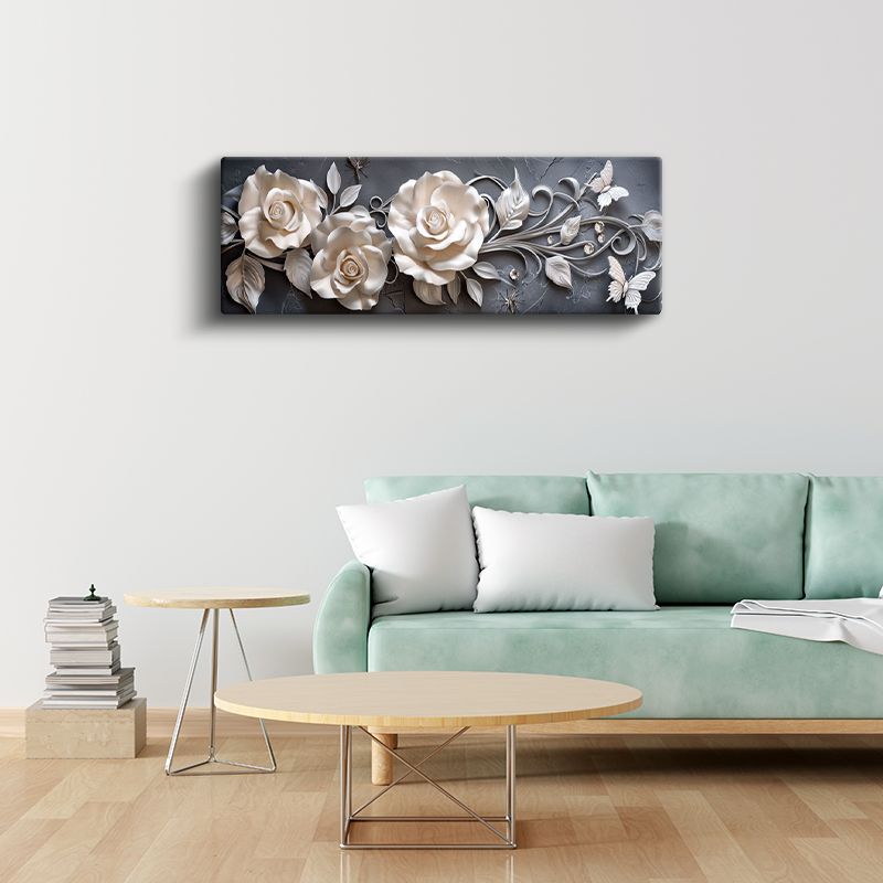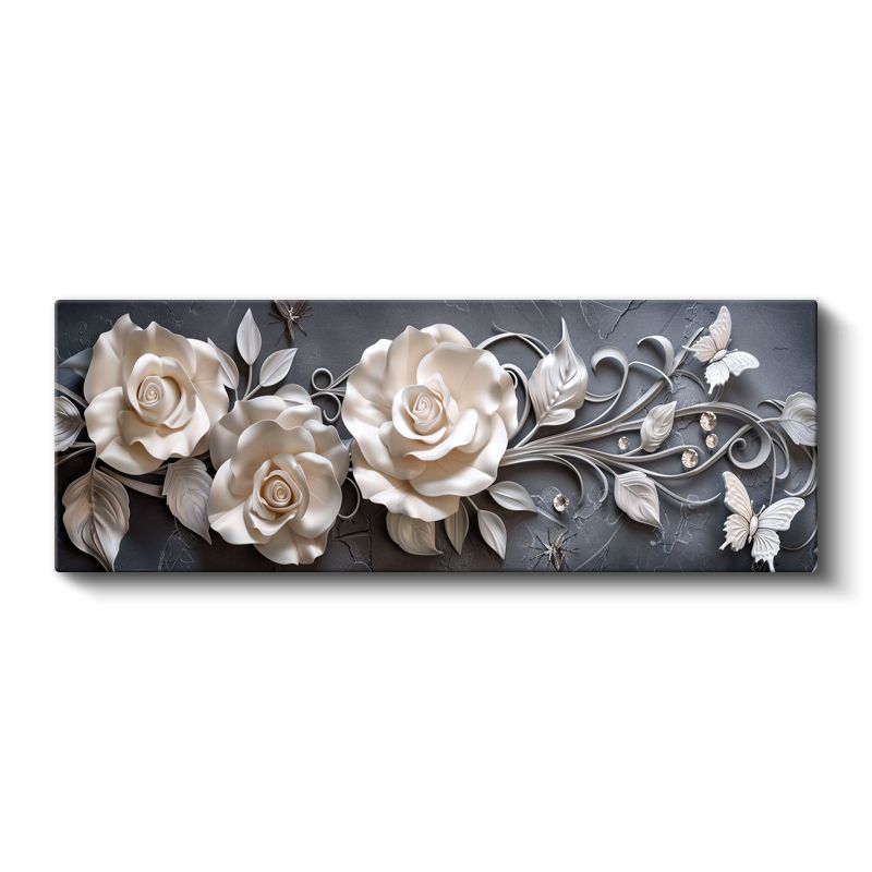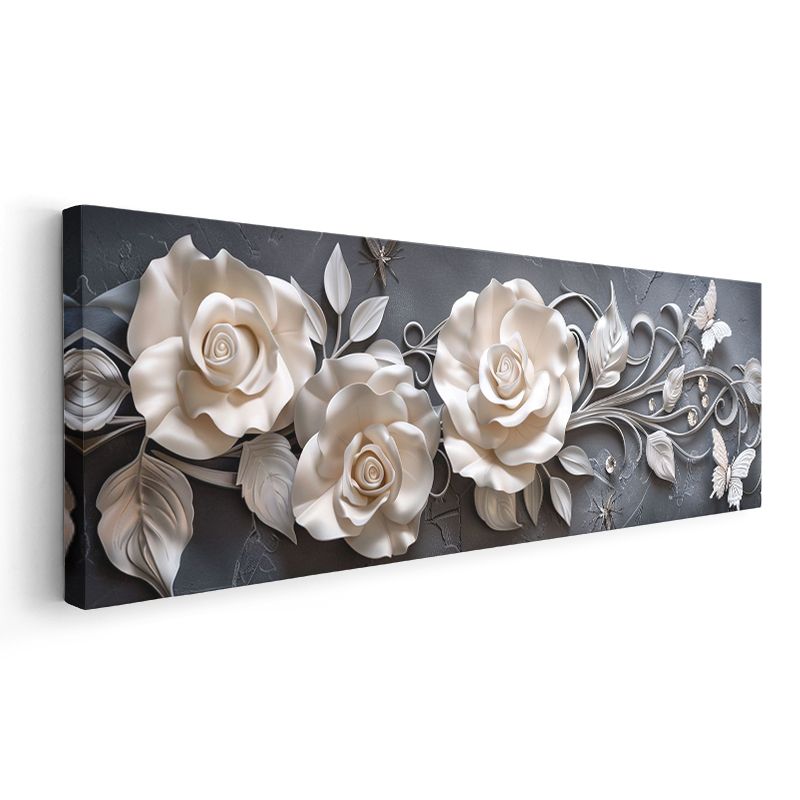 Beyaz Güller - Gri Fonda Kabartma Görünümlü Çiçek Kompozisyonu Kanvas Tablo