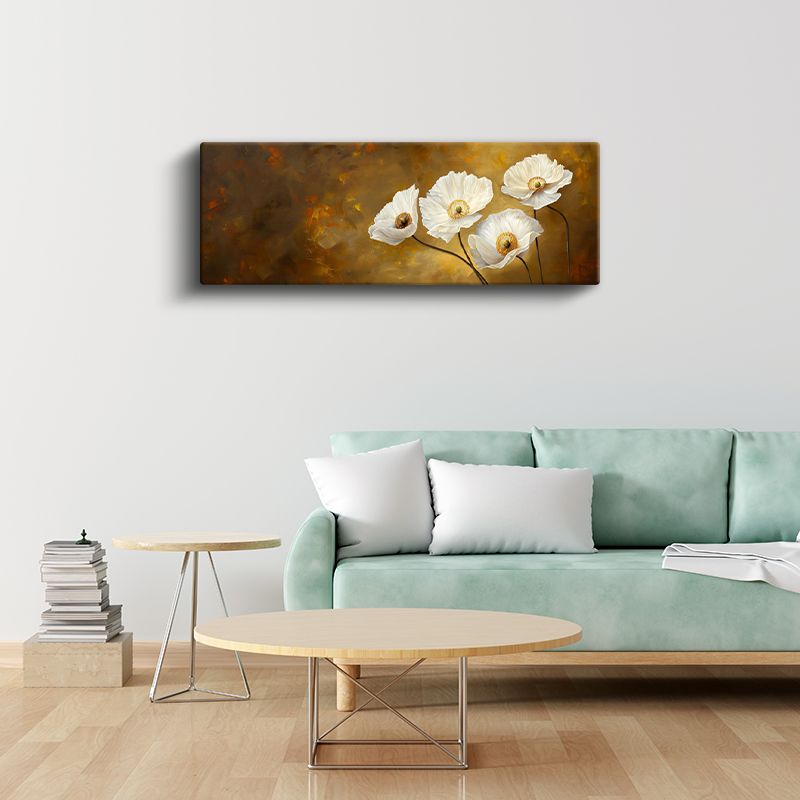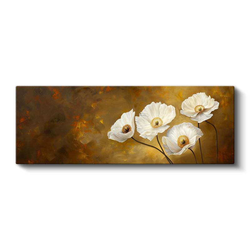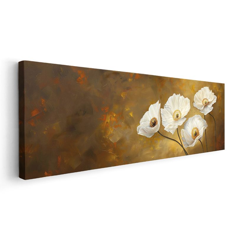 Beyaz Haşhaşlar - Altın Tonlarında Yağlı Boya Tarzı Çiçek Kompozisyonu Kanvas Tablo