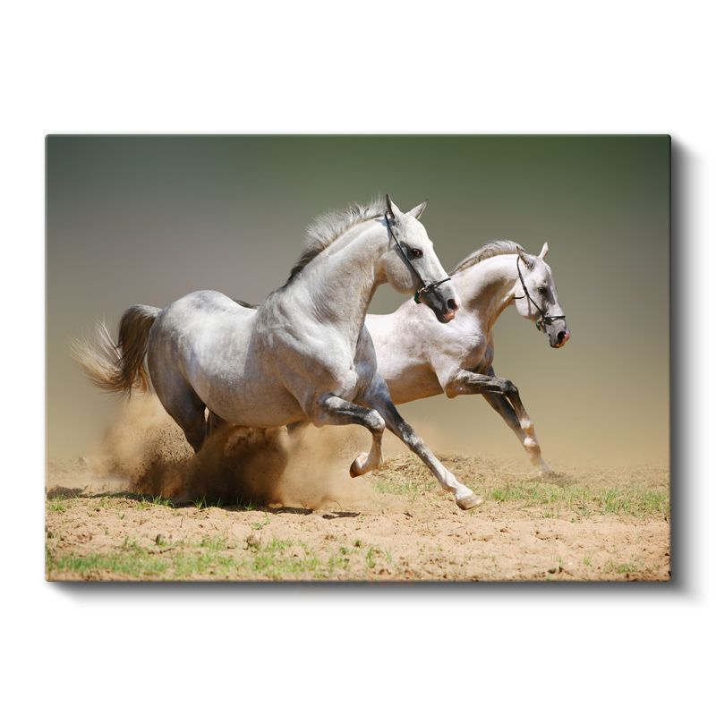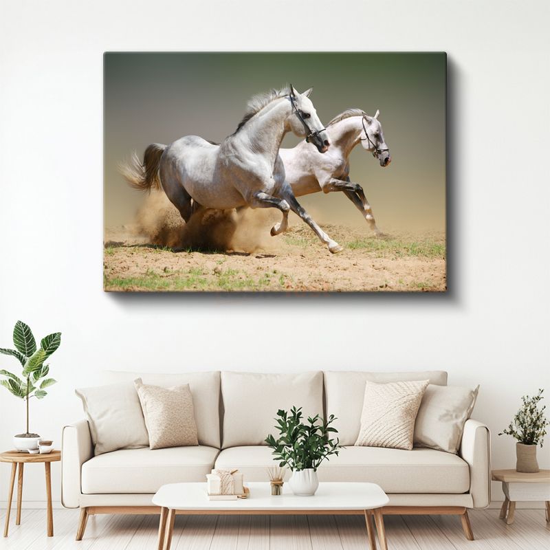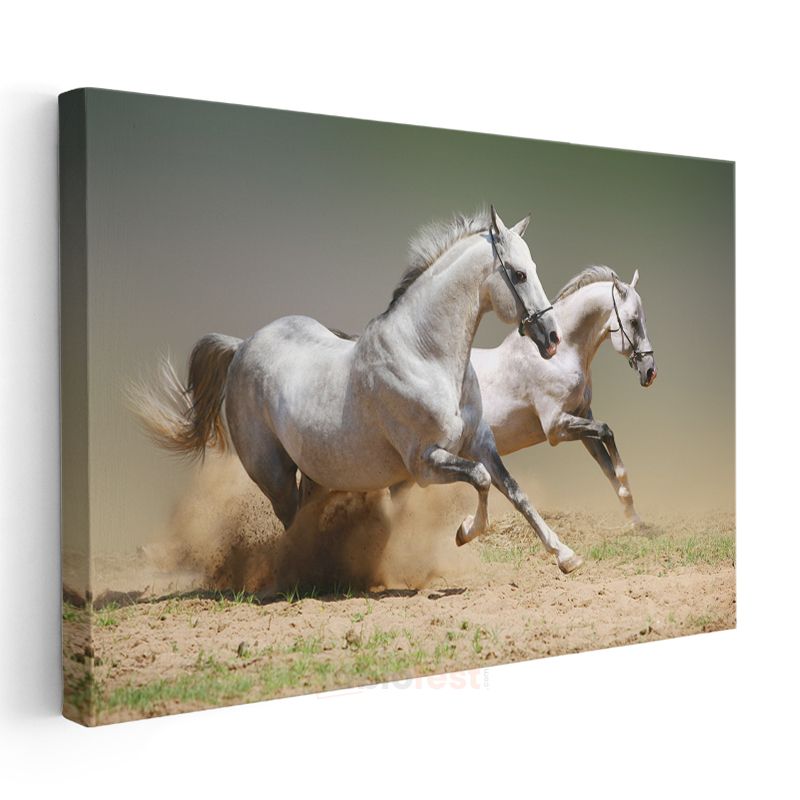 Beyaz İkili - Toprakta Koşan Arap Atları Kanvas Tablo