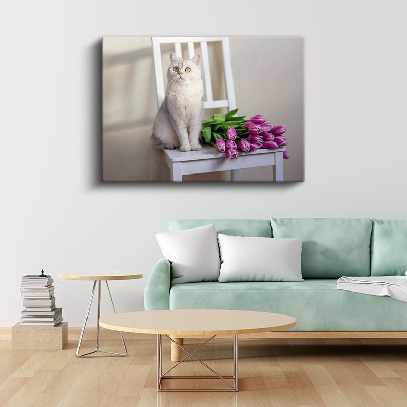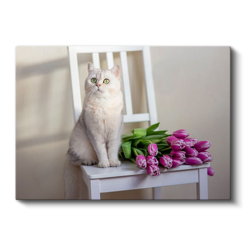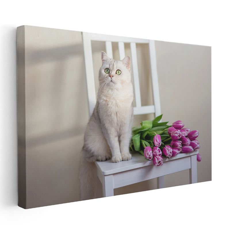 Beyaz Kedi - Mor Lalelerle Zarif Evcil Hayvan Portresi Kanvas Tablo