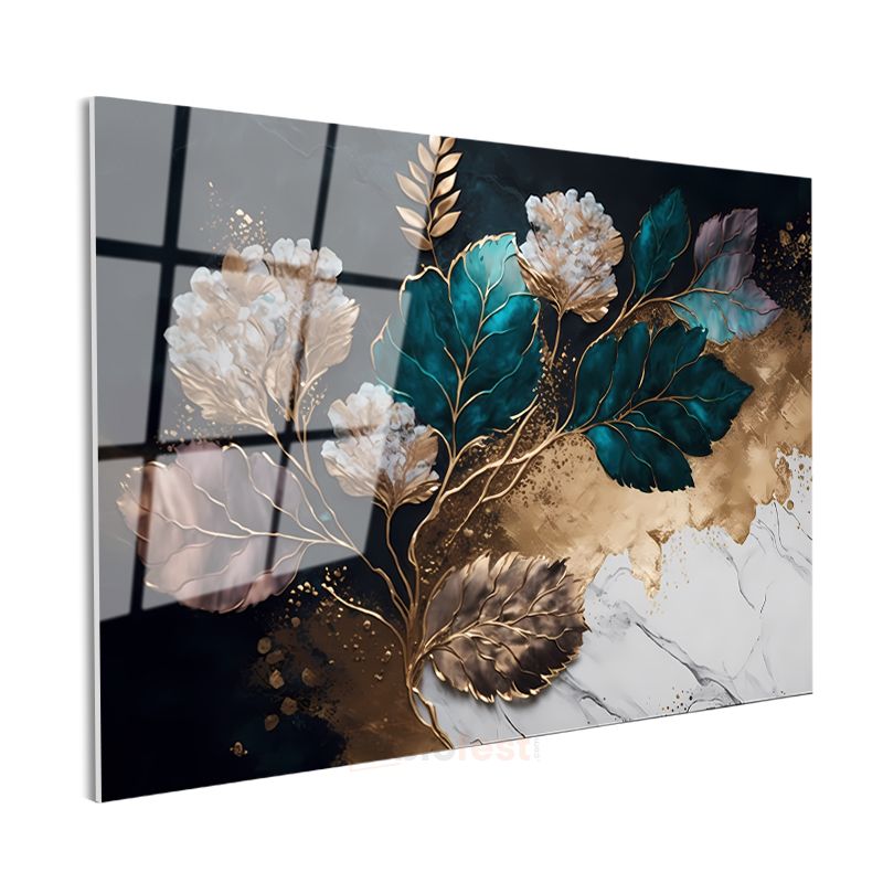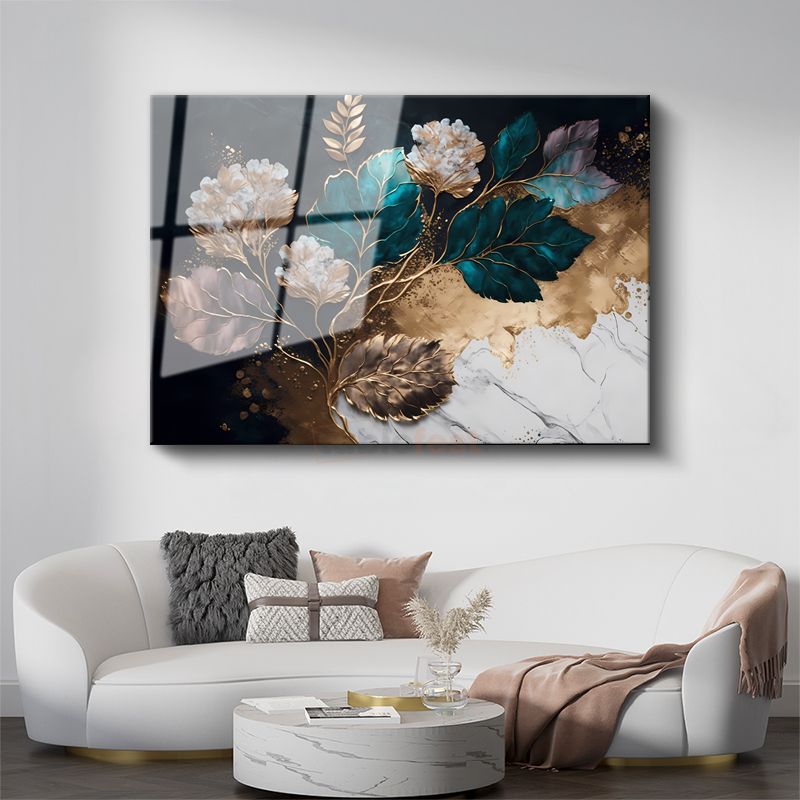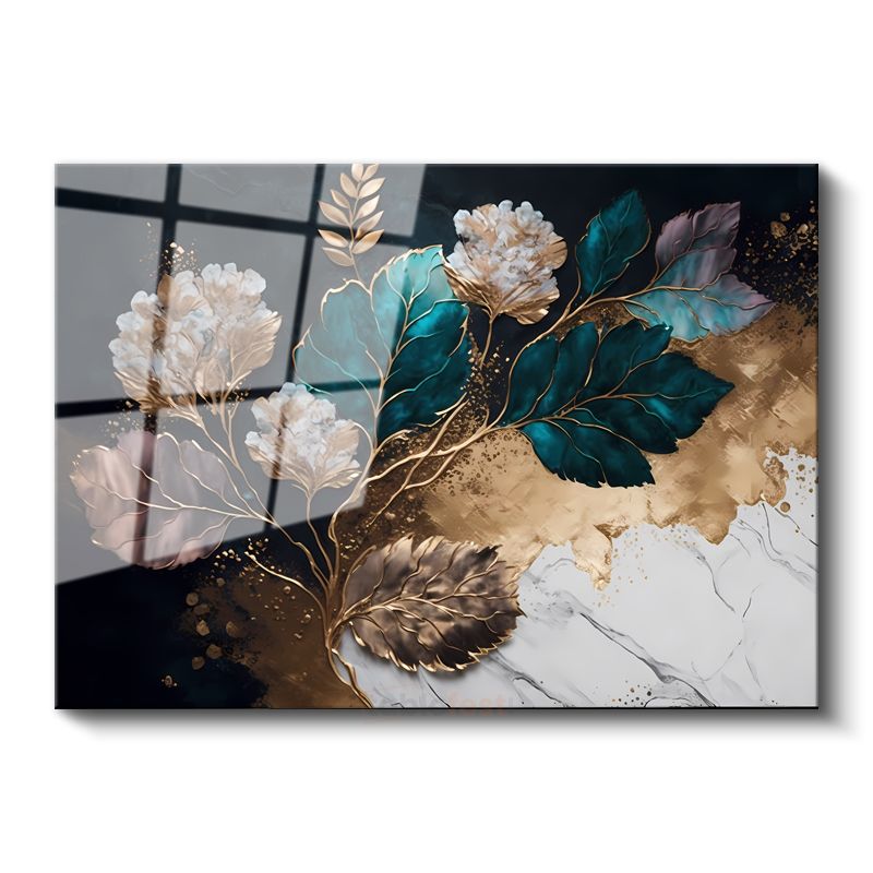 Beyaz Laleler - Mavi Tonlu Zarif Çiçek Deseni Cam Tablo