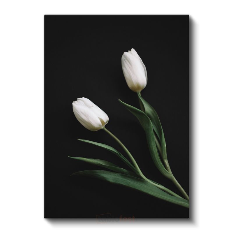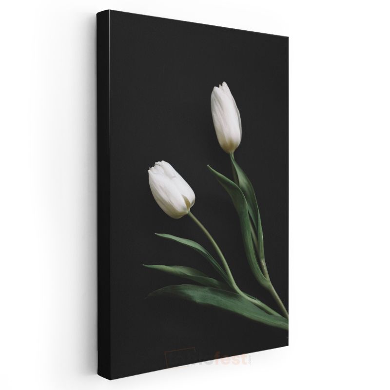 Beyaz Laleler - Siyah Fonda Minimalist Çiçek İkilisi Kanvas Tablo