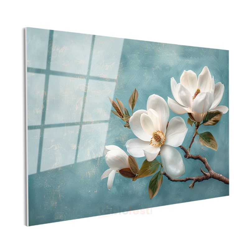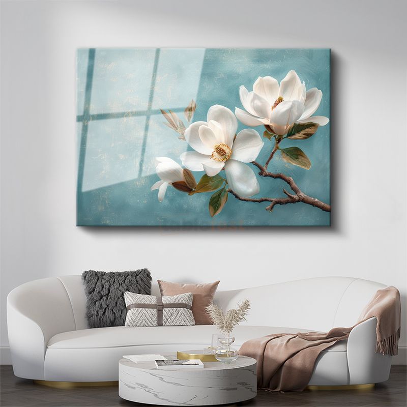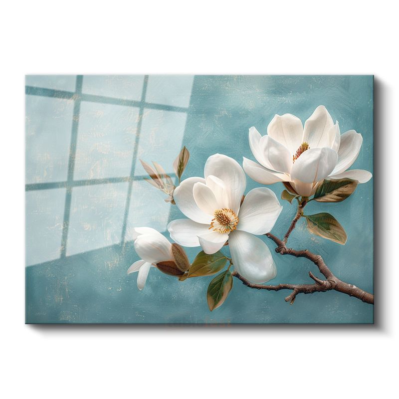 Beyaz Magnolya - Turkuaz Fonda Zarif Çiçek Dalı Cam Tablo