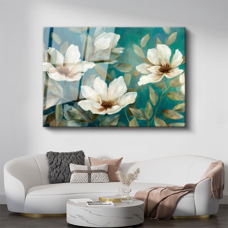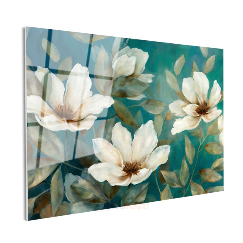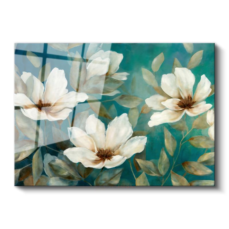 Beyaz Magnolya - Turkuaz Zemin Üzerinde Zarif Çiçekler Cam Tablo