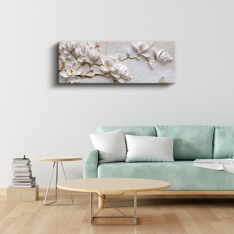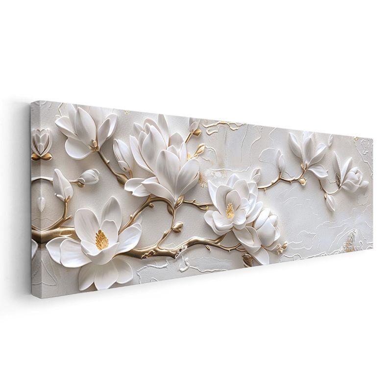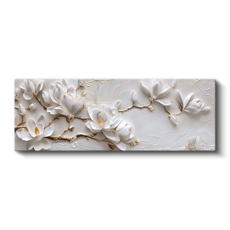 Beyaz Manolyalar - Altın Detaylı Kabartma Görünümlü Çiçek Dalı Kanvas Tablo