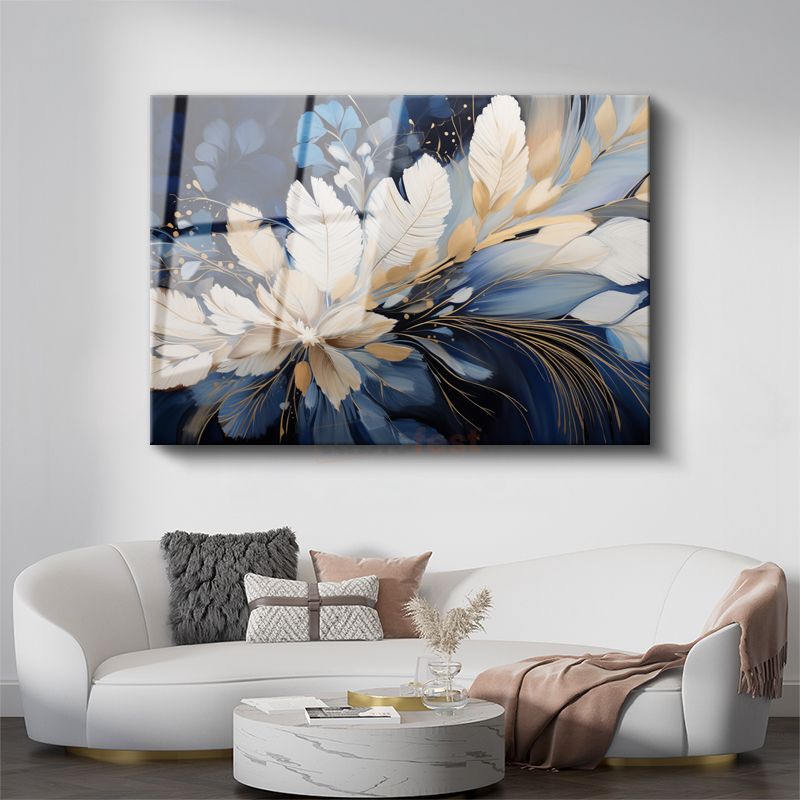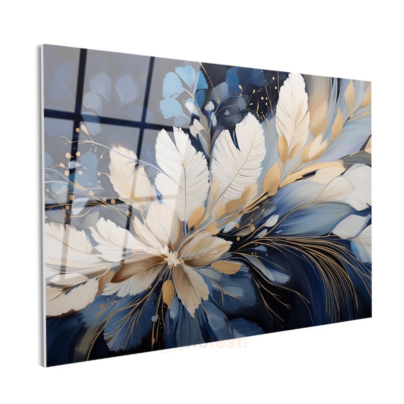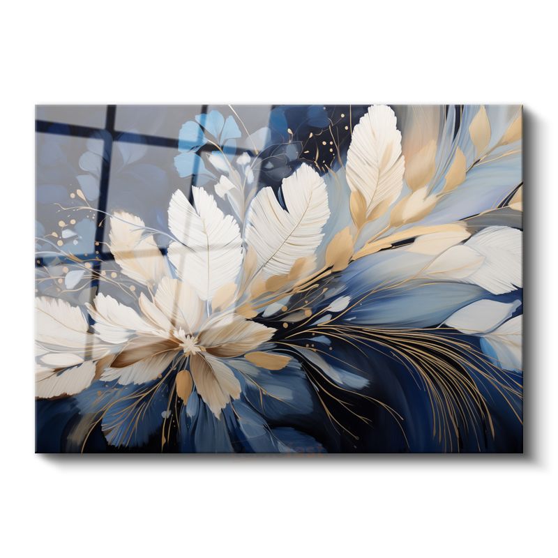 Beyaz Papatya - Mavi ve Altın Detaylı Sanatsal Kompozisyon Cam Tablo