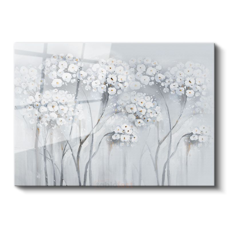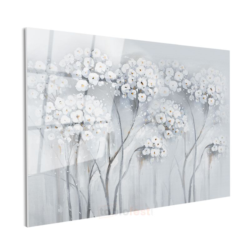 Beyaz Papatyalar - Gri Tonlarda Minimalist Çiçek Buketi Cam Tablo