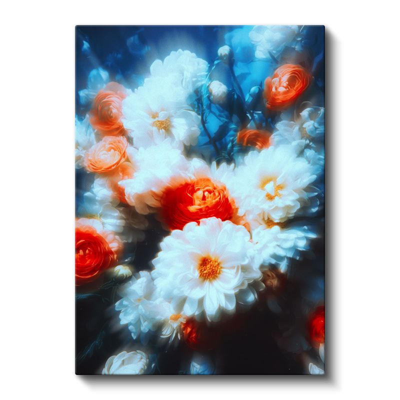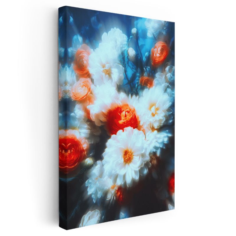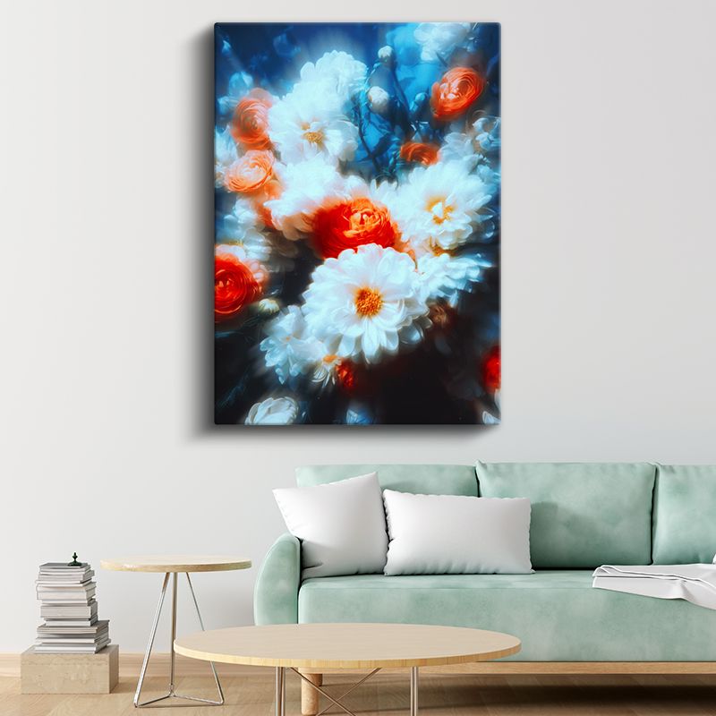 Beyaz Papatyalar - Mavi Fonda Turuncu Detaylı Buket Kanvas Tablo