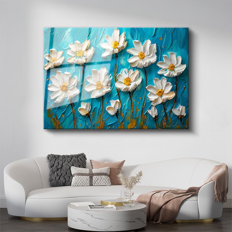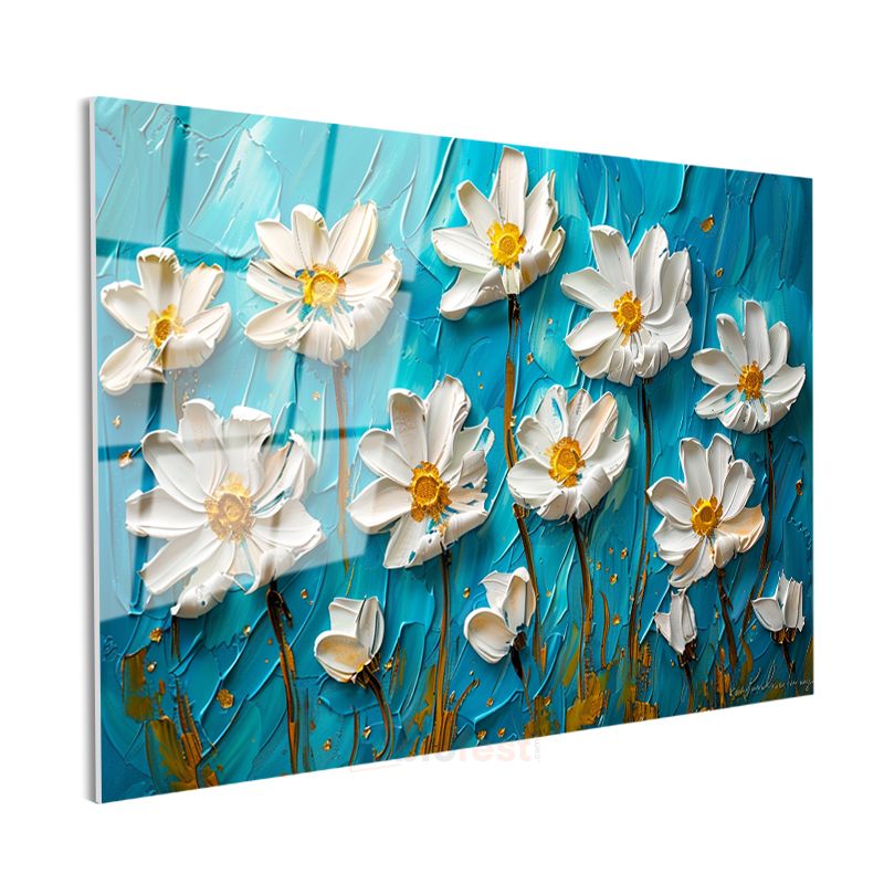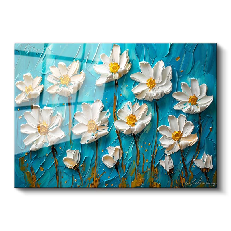 Beyaz Papatyalar - Turkuaz Fonda Kabartma Görünümlü Çiçek Deseni Cam Tablo