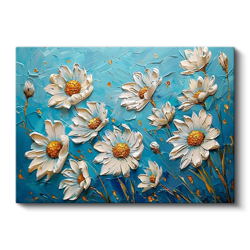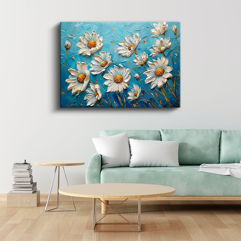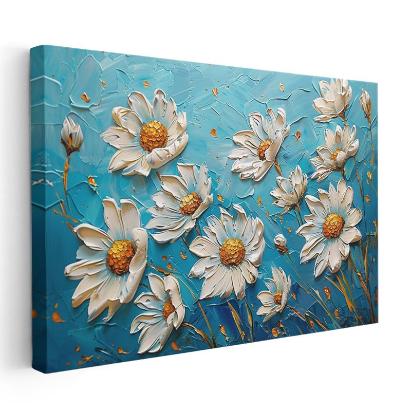 Beyaz Papatyalar - Turkuaz Fonda Kabartma Görünümlü Çiçek Deseni Kanvas Tablo