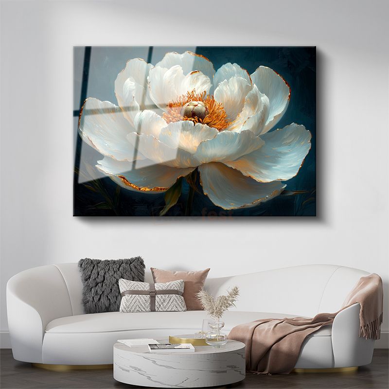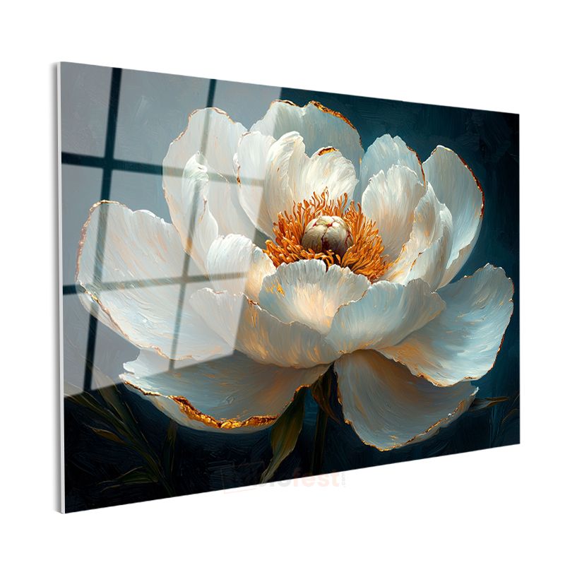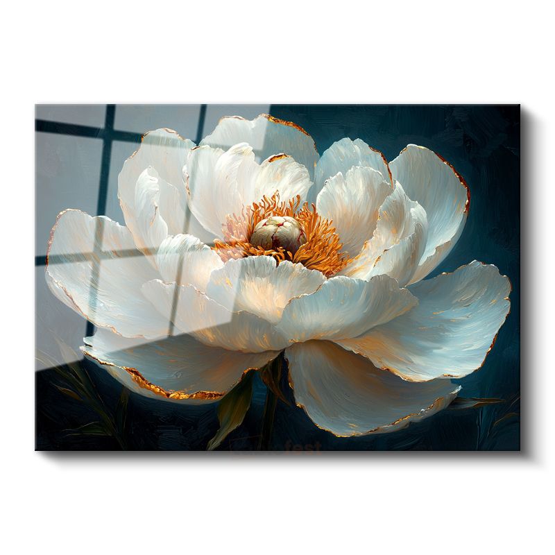 Beyaz Şakayık - Lacivert Fonlu Yağlı Boya Cam Tablo