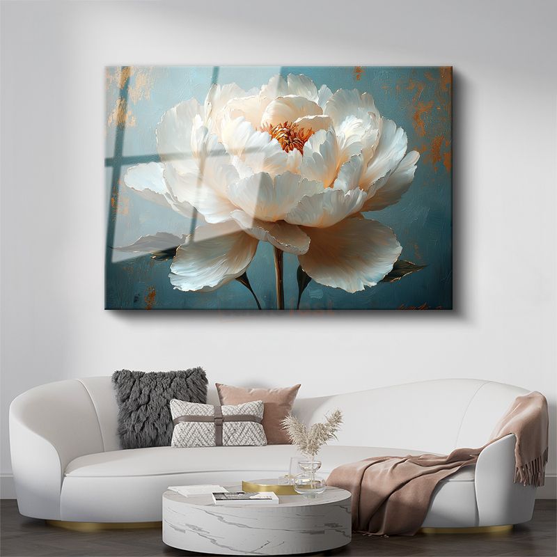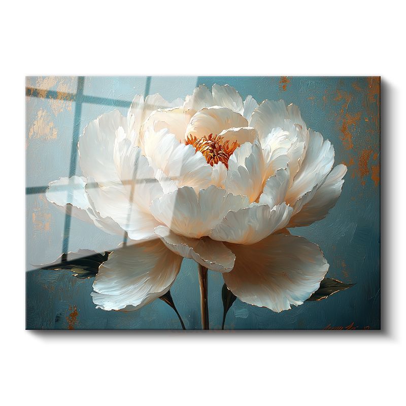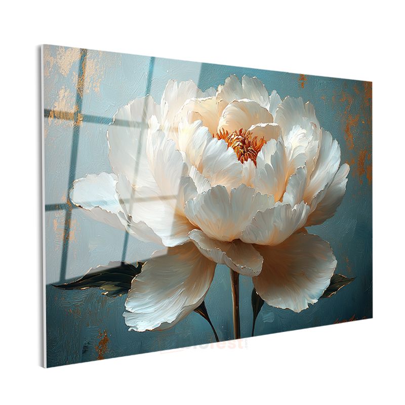 Beyaz Şakayık - Turkuaz Fonda Altın Detaylı Zarif Çiçek Cam Tablo