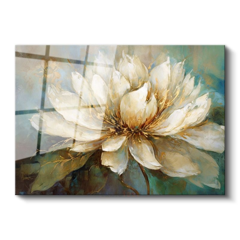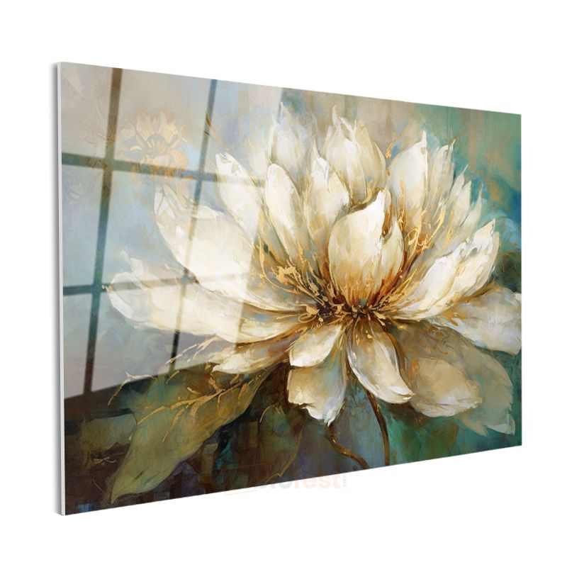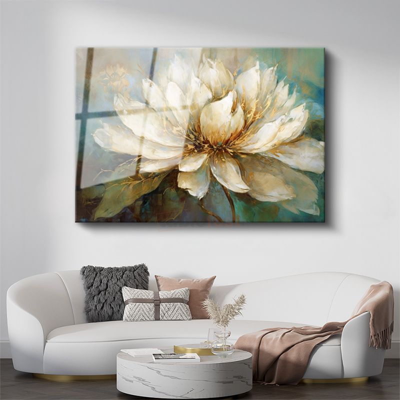Beyaz Şakayık - Turkuaz Fonlu Yağlı Boya Cam Tablo