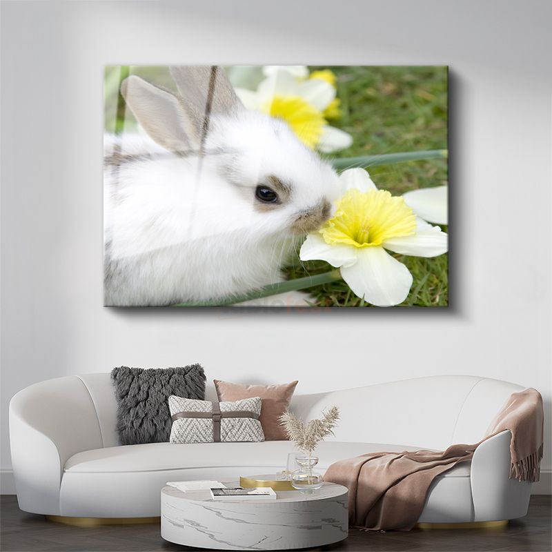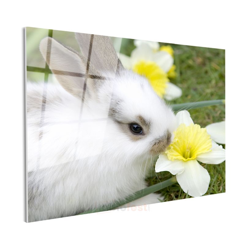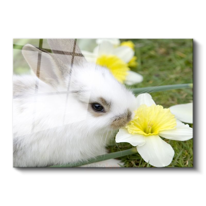 Beyaz Tavşan - Nergis Çiçeği ile Sevimli Kompozisyon Cam Tablo