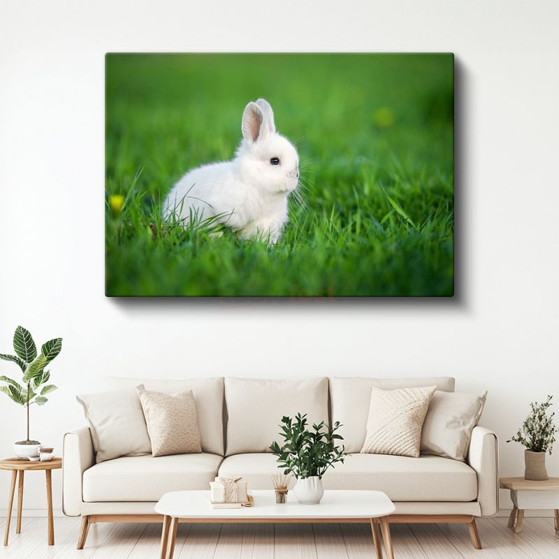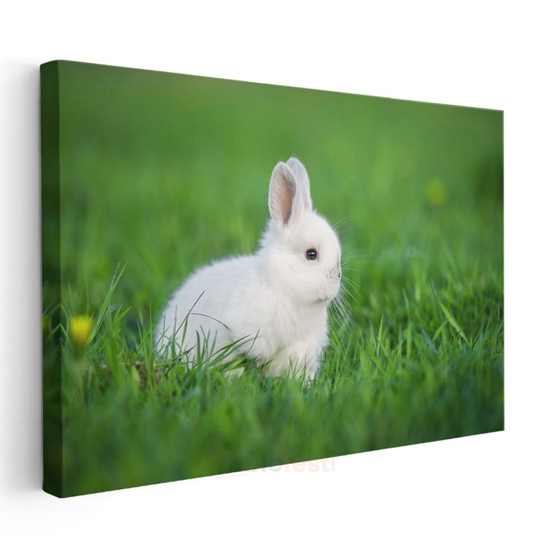 Beyaz Tavşan - Yeşil Çimende Sevimli Dostumuz Kanvas Tablo