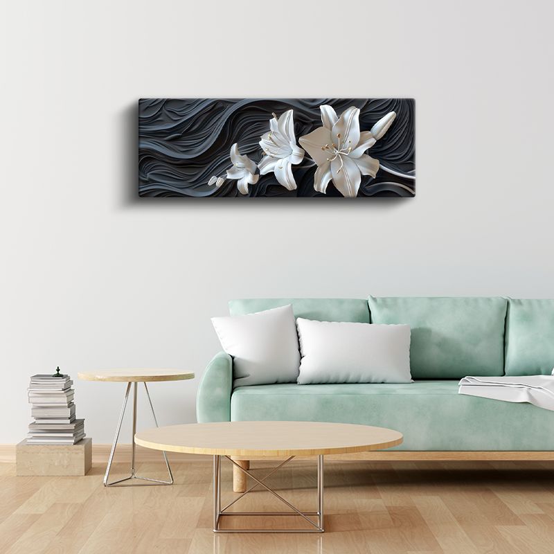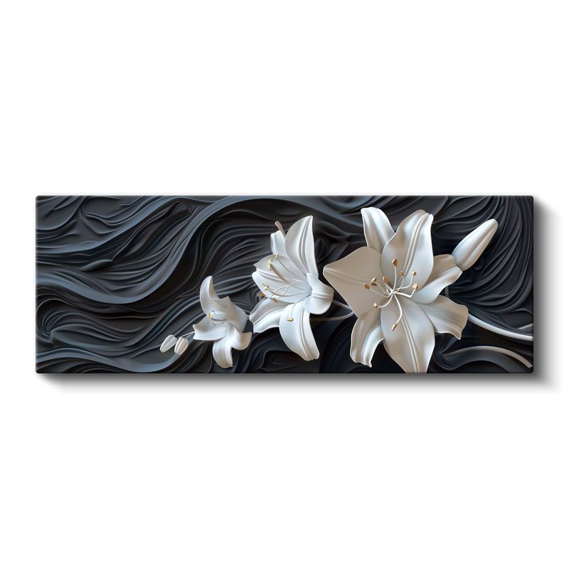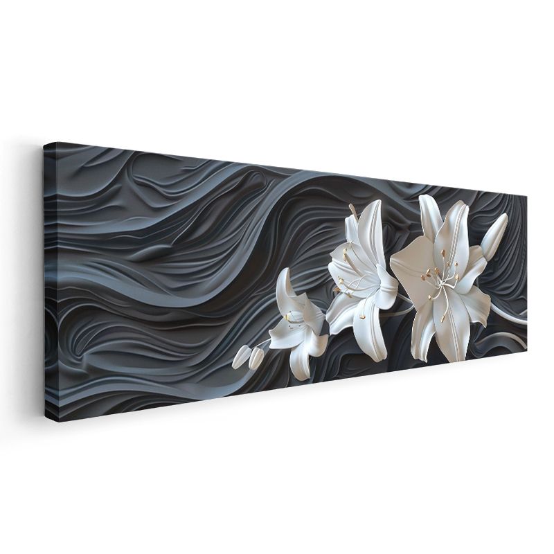Beyaz Zambaklar - Dalgalı Siyah Fonda 3D Çiçek Tasarımı Kanvas Tablo