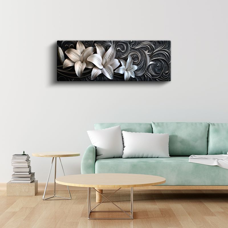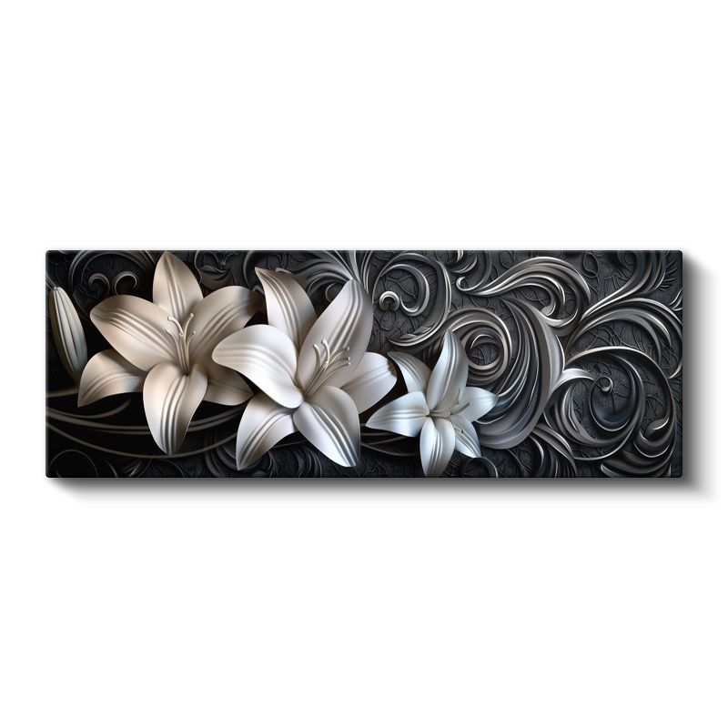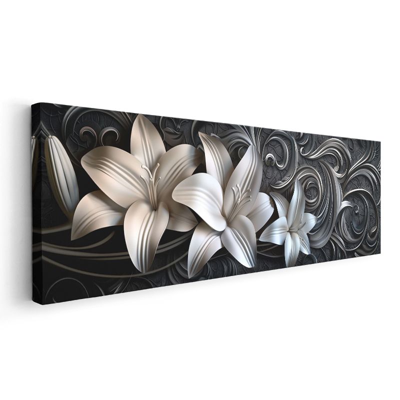 Beyaz Zambaklar - Siyah Zeminde Zarif Kıvrımlı Tasarım Kanvas Tablo