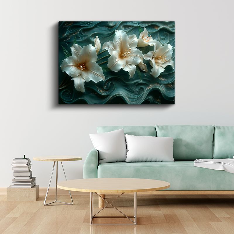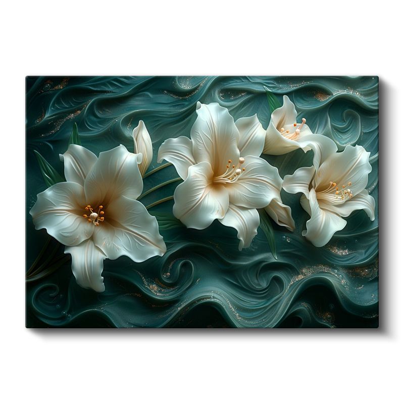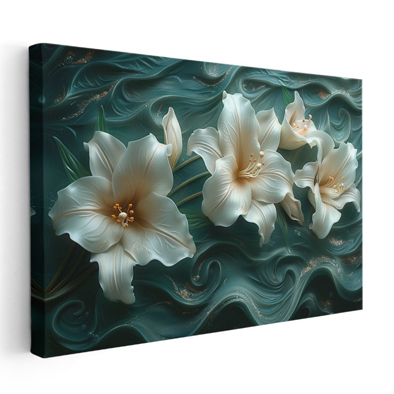 Beyaz Zambaklar - Turkuaz Dalgalı Dokulu Dekoratif Kanvas Tablo