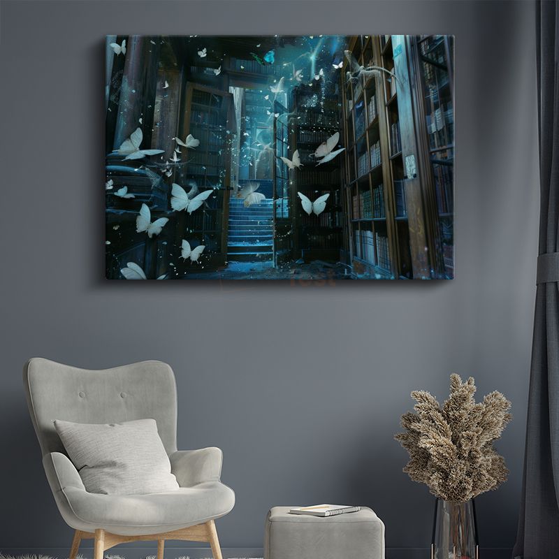 Bilgelik Kanatları - Kütüphanede Dans Eden Kelebekler Kanvas Tablo