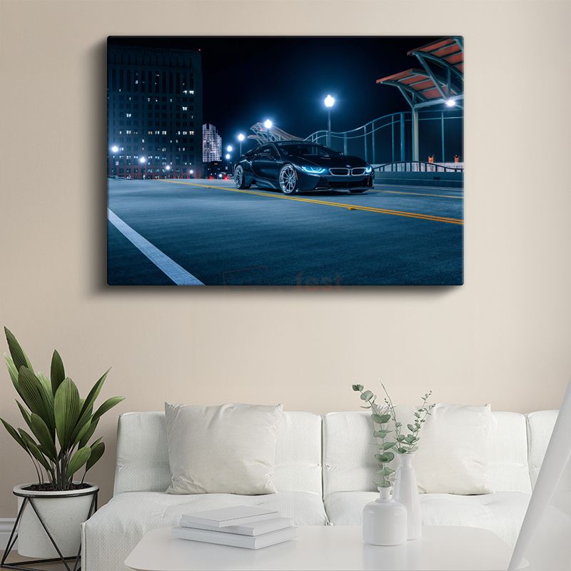 BMW i8 - Gece Şehir Manzarasında Lüks Spor Otomobil Kanvas Tablo