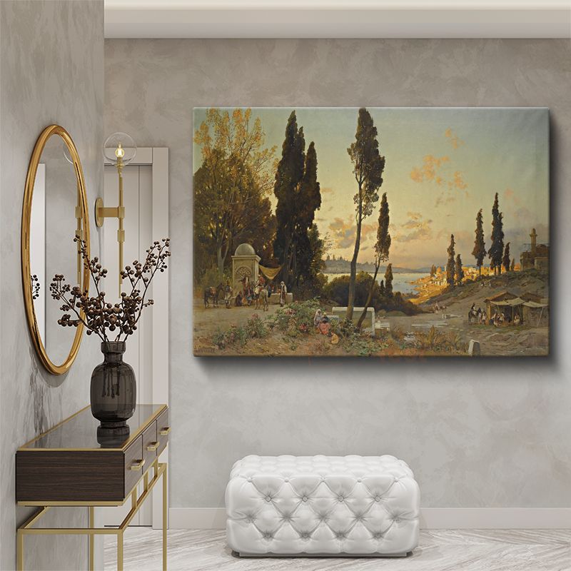 Boğaz Manzarası - Servi Ağaçları ve Çeşme Kanvas Tablo