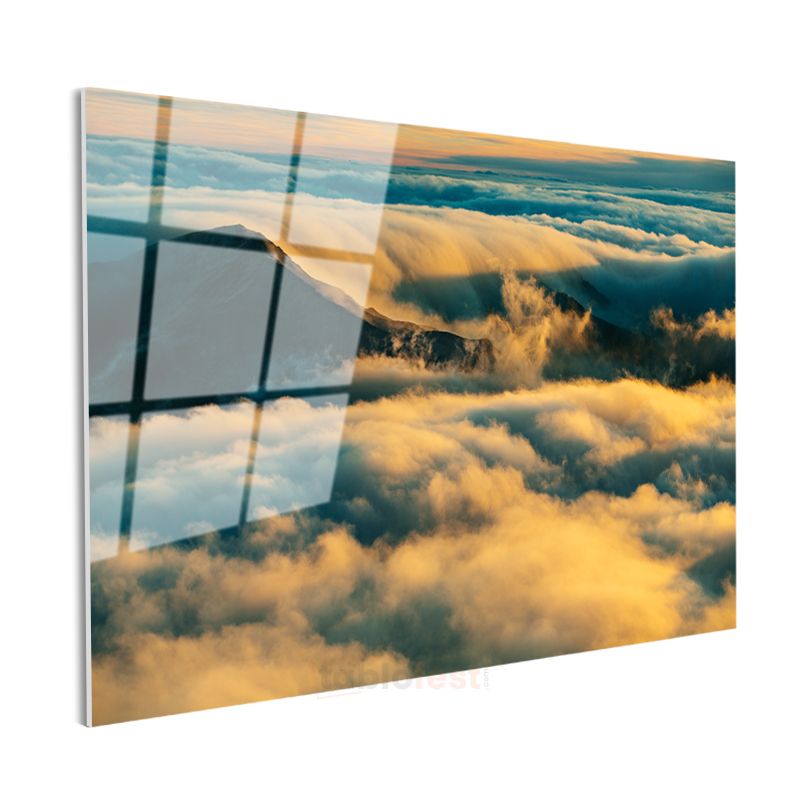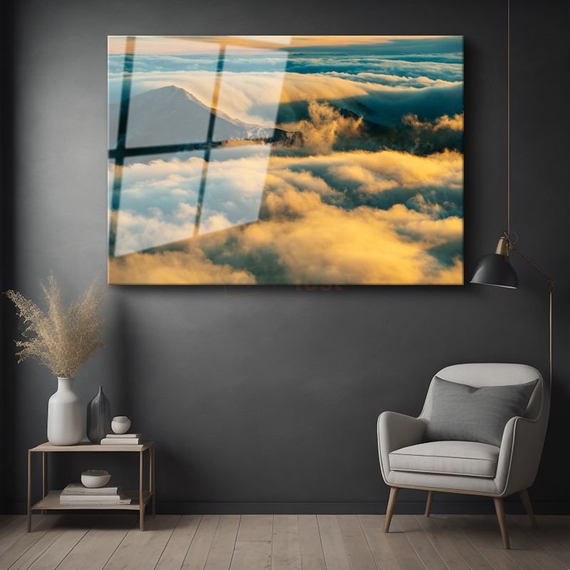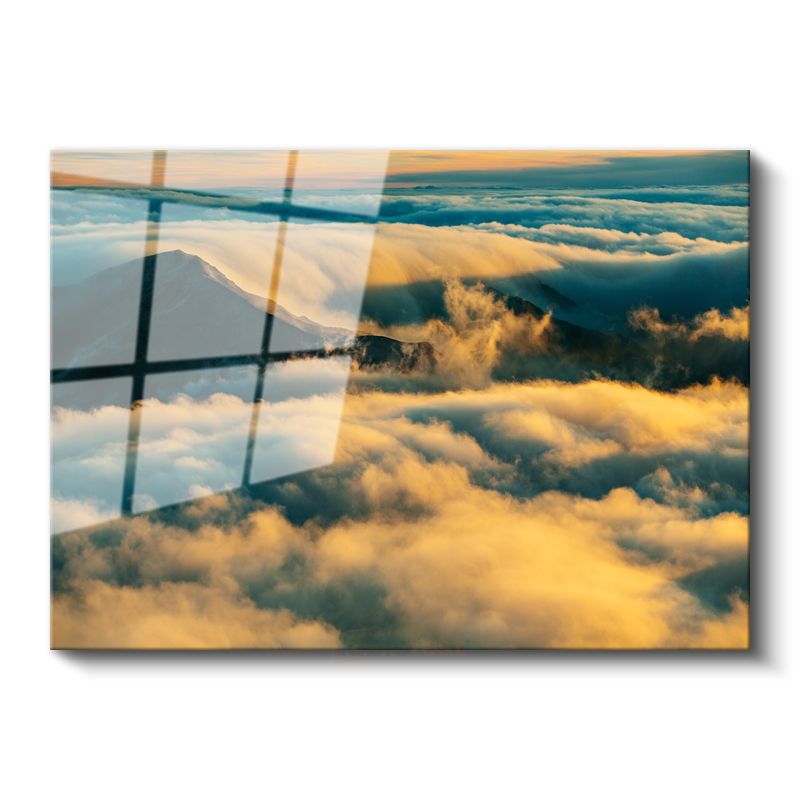 Bulutlar Üstünde - Altın Işıklı Dağ Zirvesi Cam Tablo