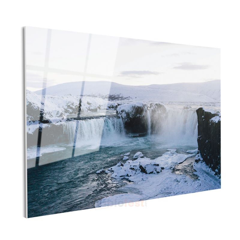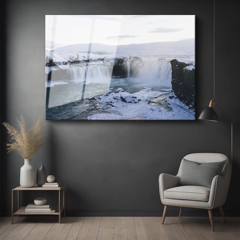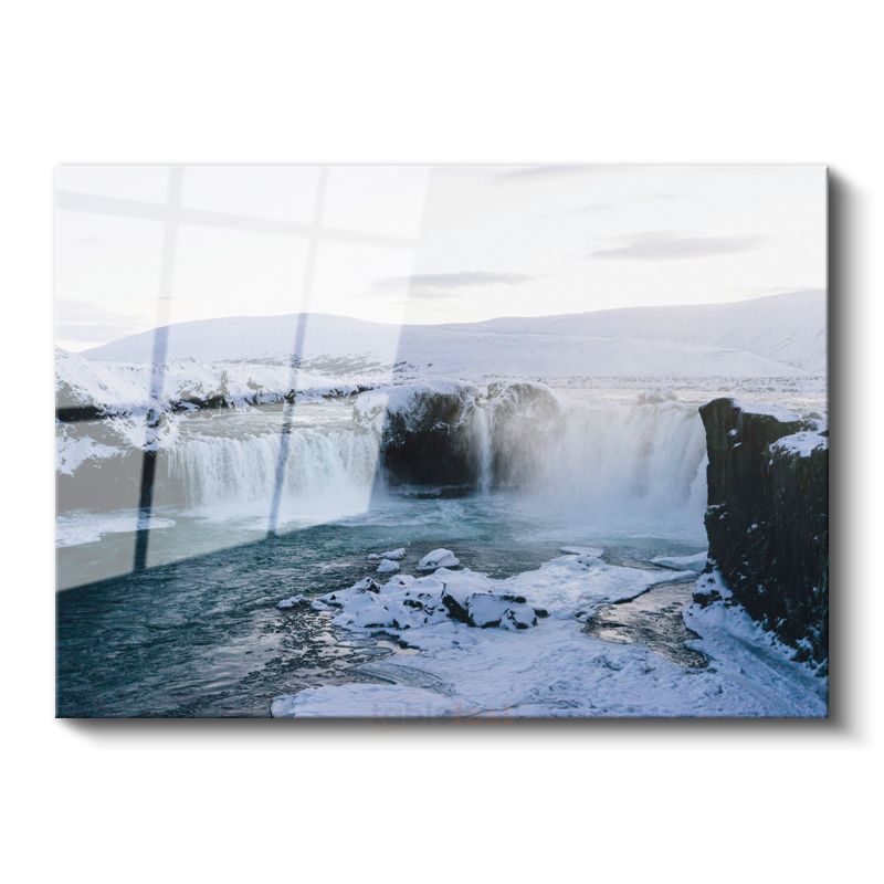 Buzul Şelale - Karlı Dağların Arasında Akan Turkuaz Sular Cam Tablo