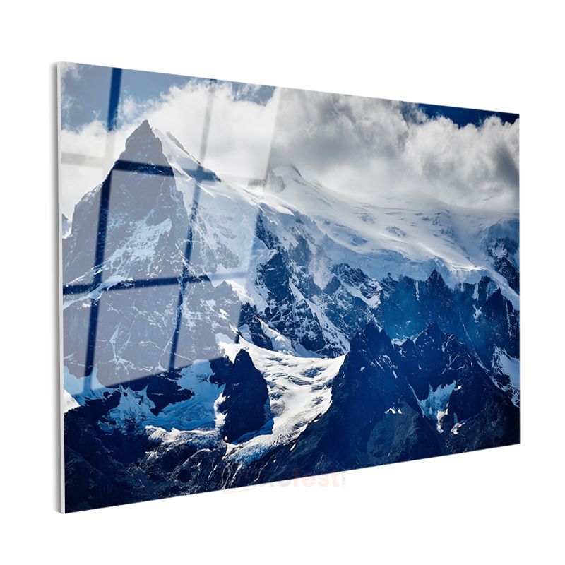 Buzul Zirveler - Mavi Tonlarda Dağ Silsilesi Cam Tablo
