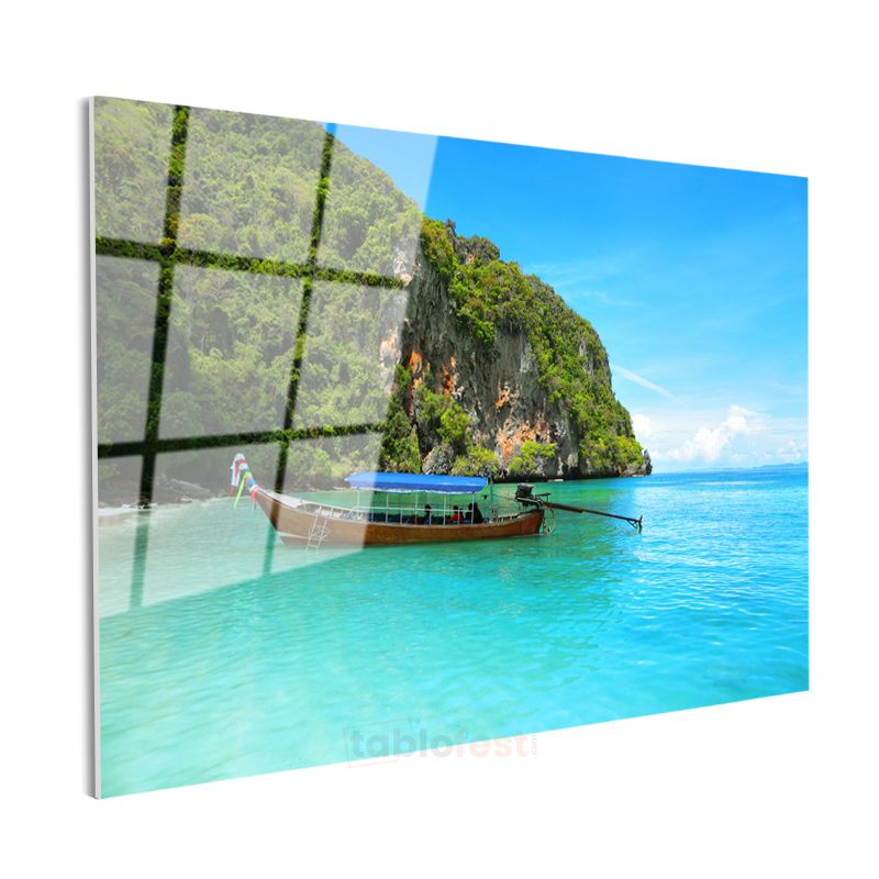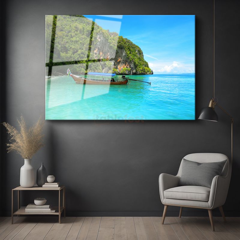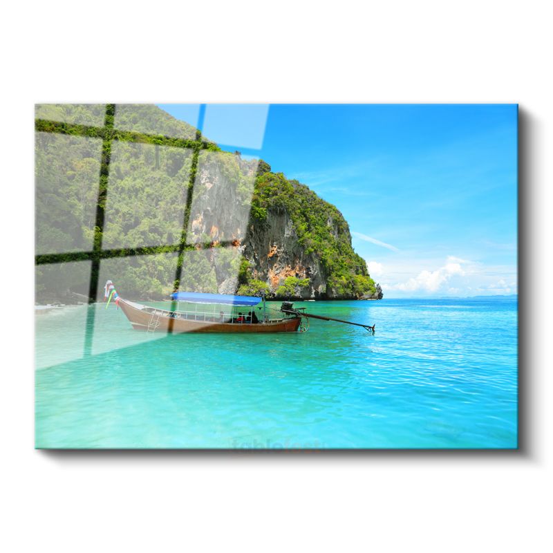Cennet Koyları - Turkuaz Suda Yüzen Tekne Cam Tablo