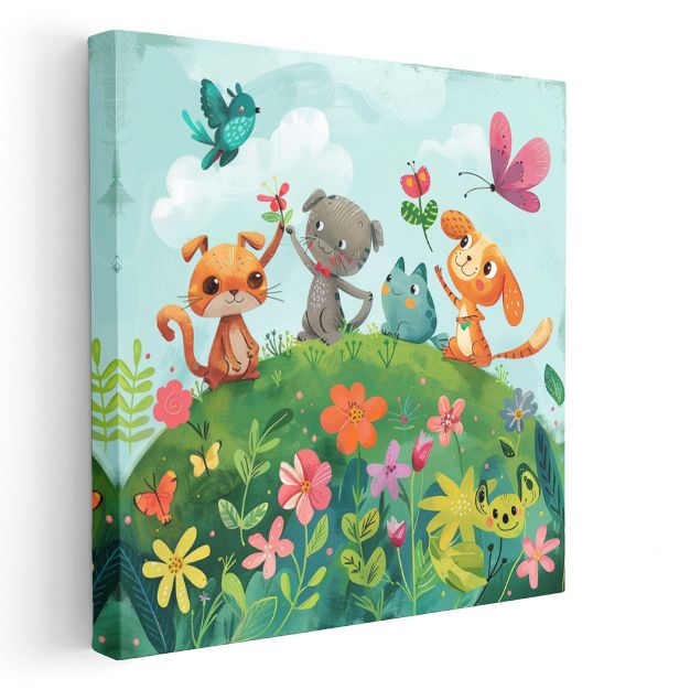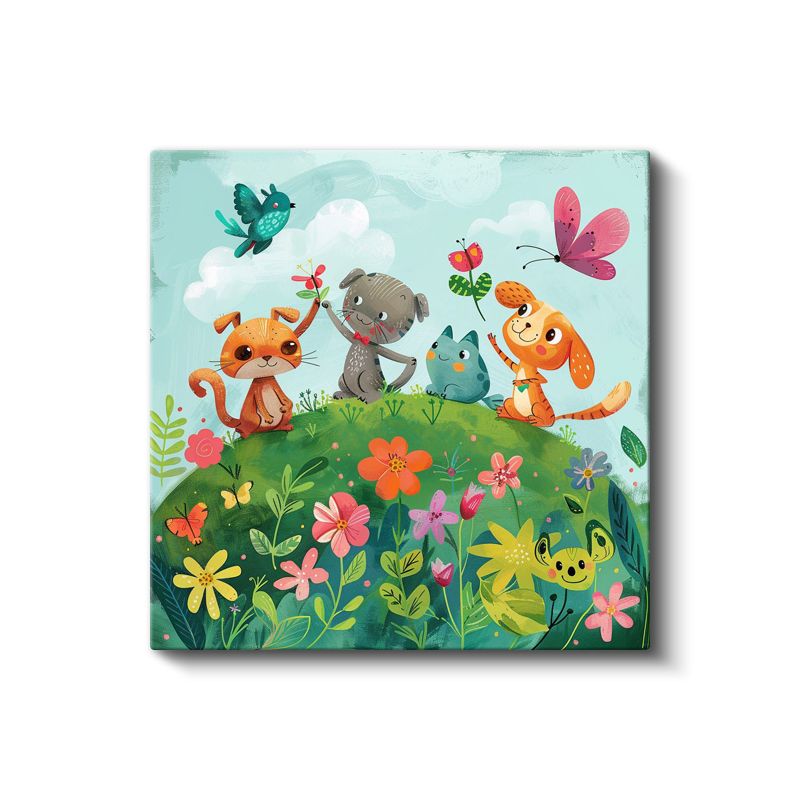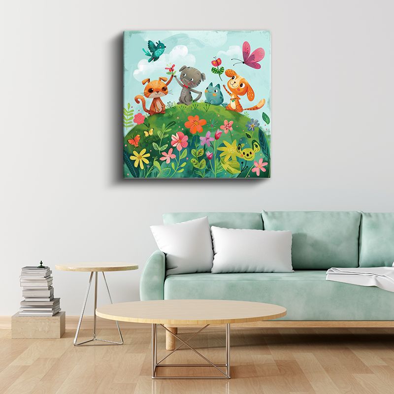 Çiçek Bahçesi - Sevimli Hayvan Dostları Kanvas Tablo