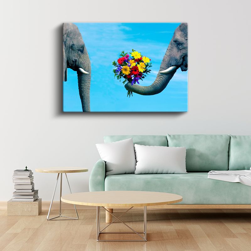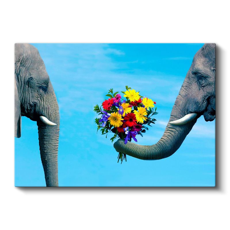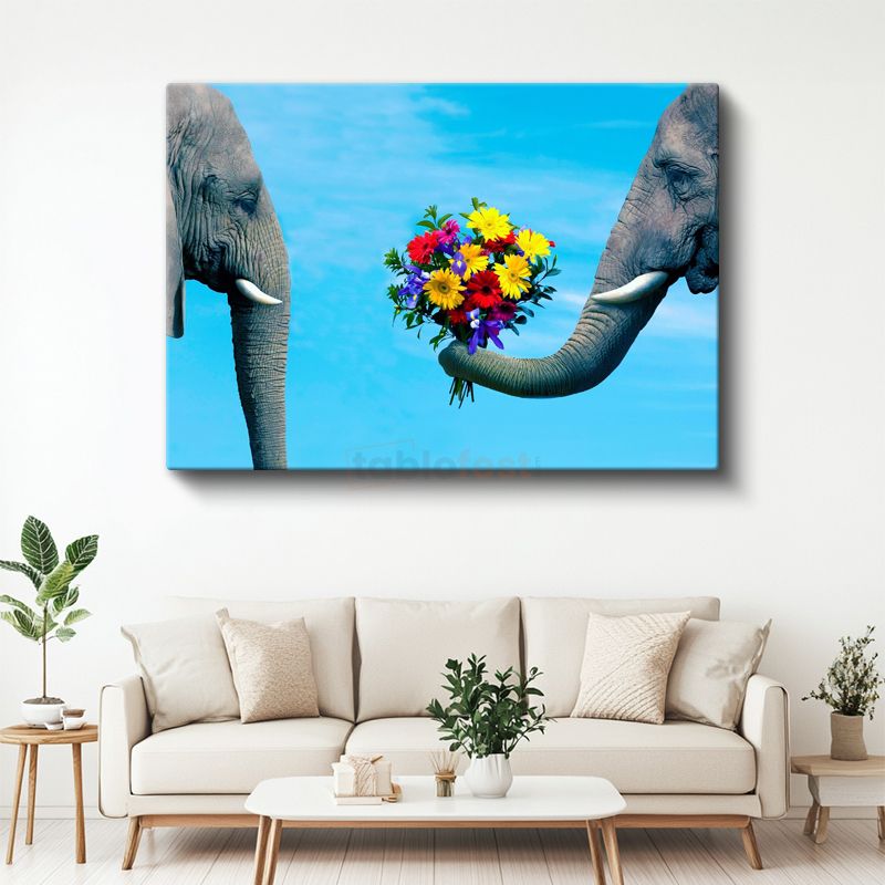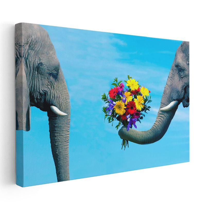 Çiçek Buketi - Hortumlarıyla Hediye Taşıyan Filler Kanvas Tablo