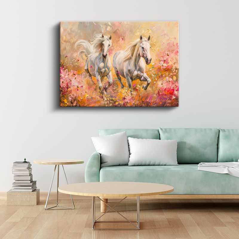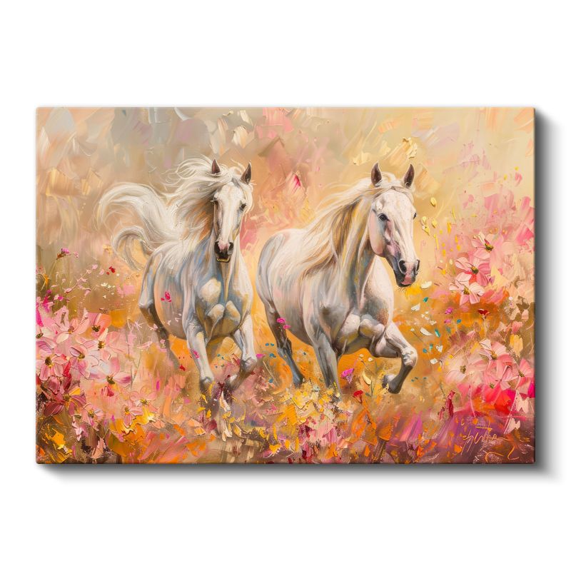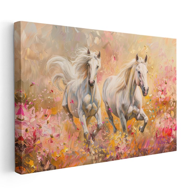 Çiçek Tarlası - Pembe Tonlarda Koşan Beyaz Atlar Kanvas Tablo
