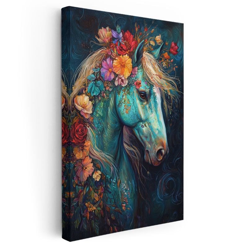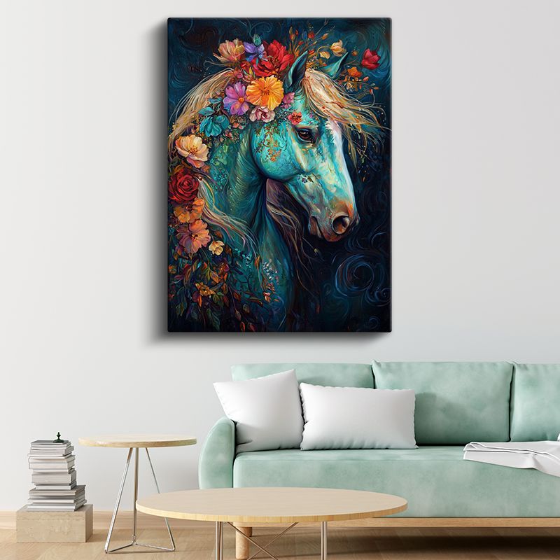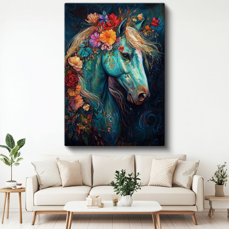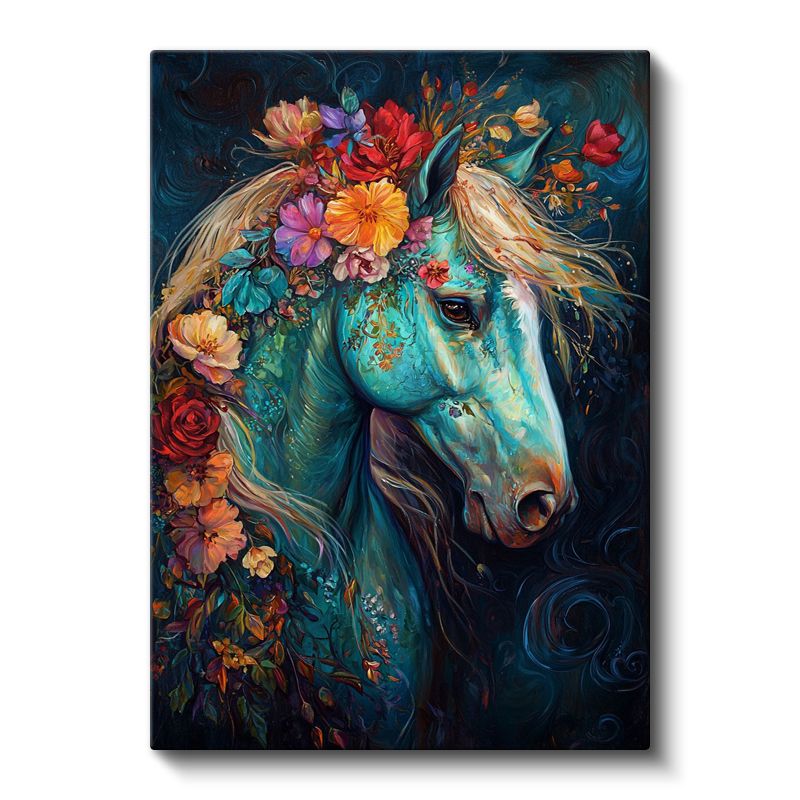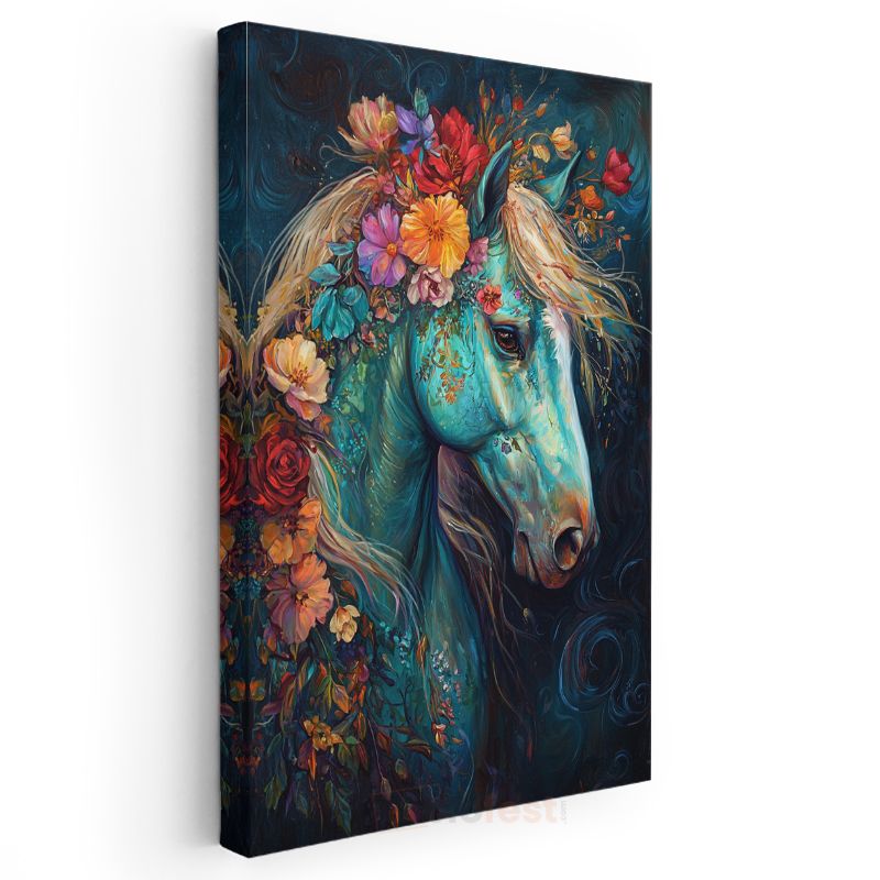 Çiçekli At - Mavi Zeminde Renkli Çiçeklerle Süslü Portre Kanvas Tablo