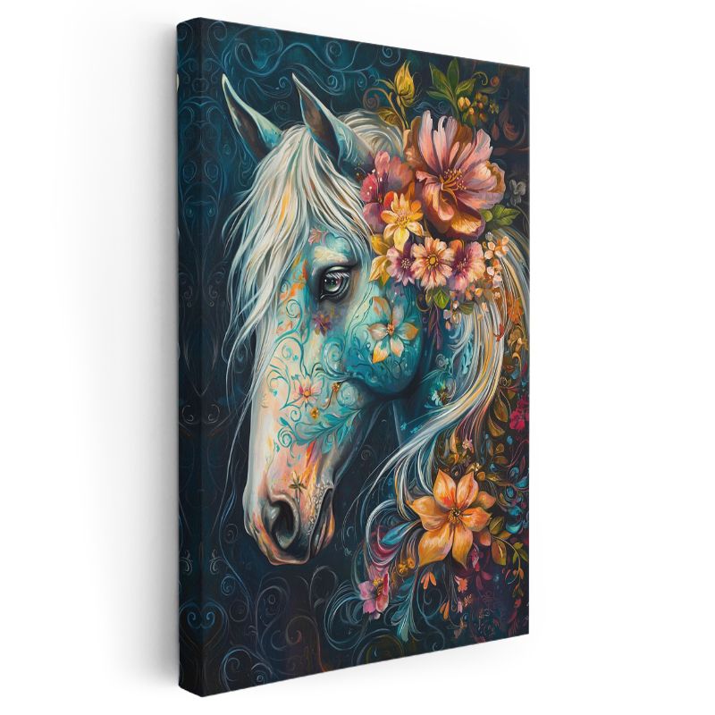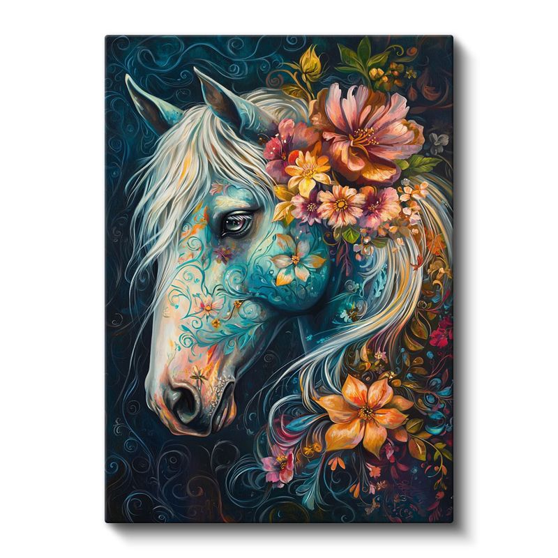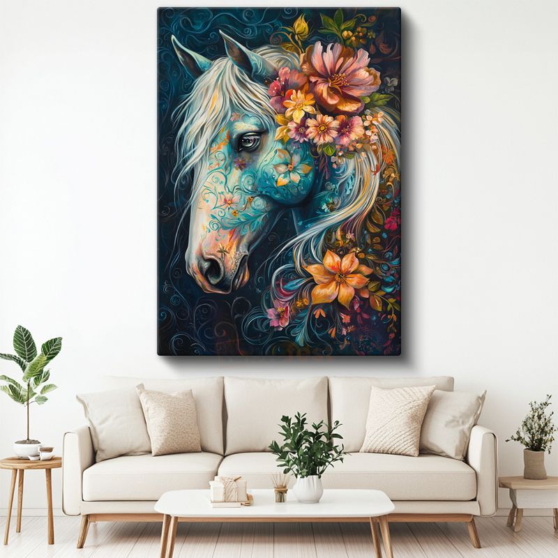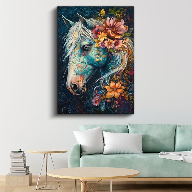 Çiçekli At - Turkuaz Zeminde Çiçek Desenli Profil Kanvas Tablo