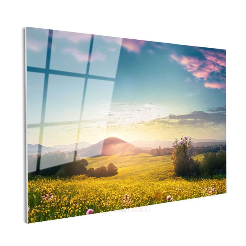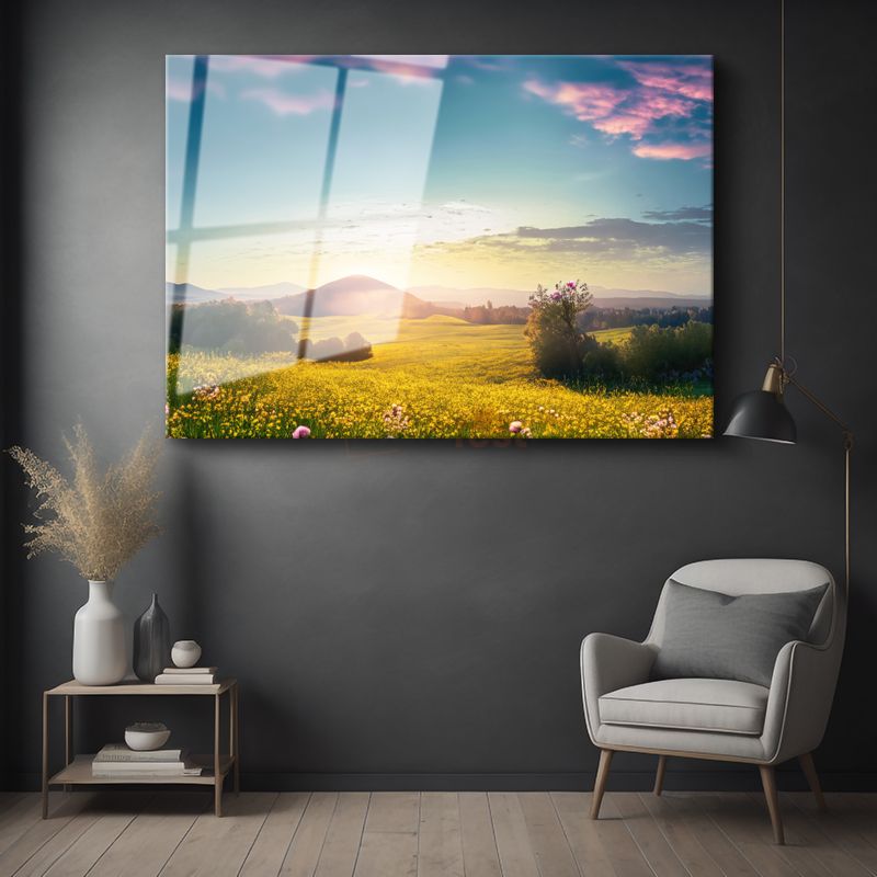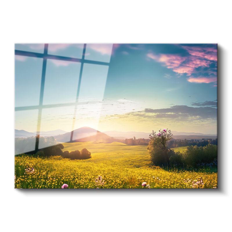 Çiçekli Çayır - Güneş Işığında Parlayan Bahar Manzarası Cam Tablo