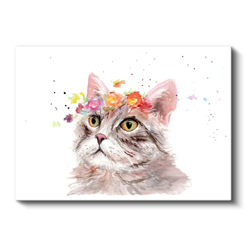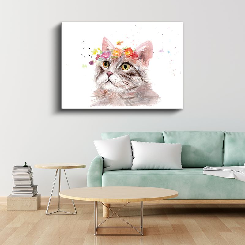 Çiçekli Kedi - Sulu Boya Tarzında Sevimli Dost Kanvas Tablo