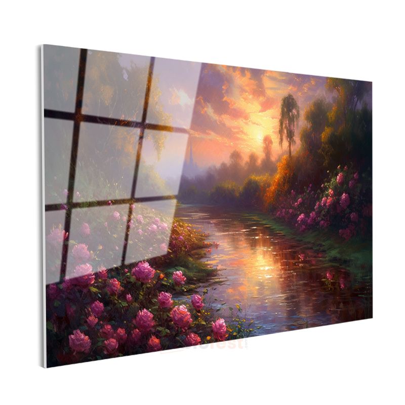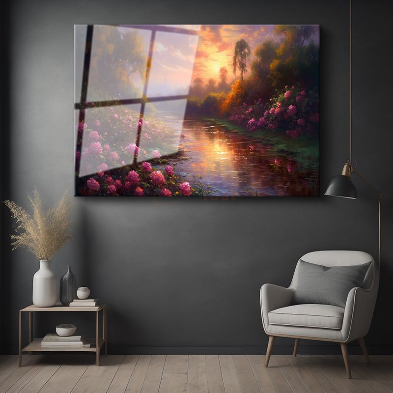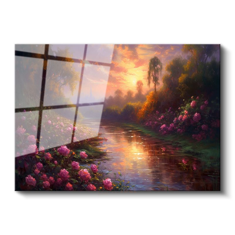 Çiçekli Nehir - Gün Batımında Pembe Çiçeklerle Bezeli Doğa Cam Tablo