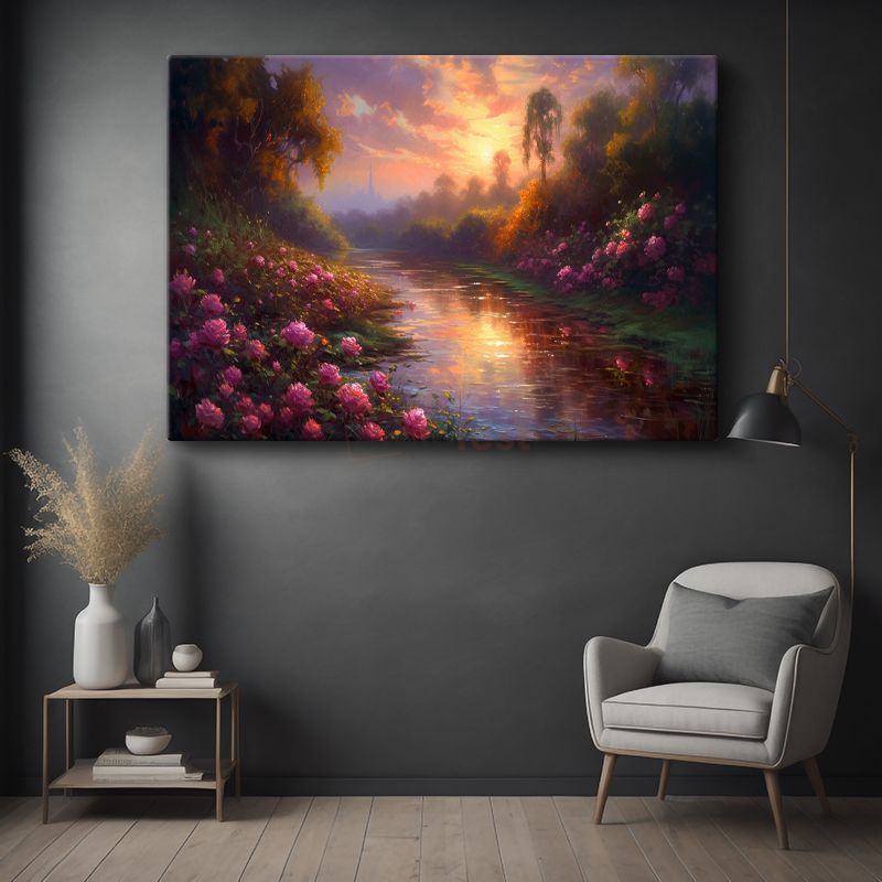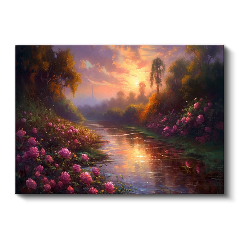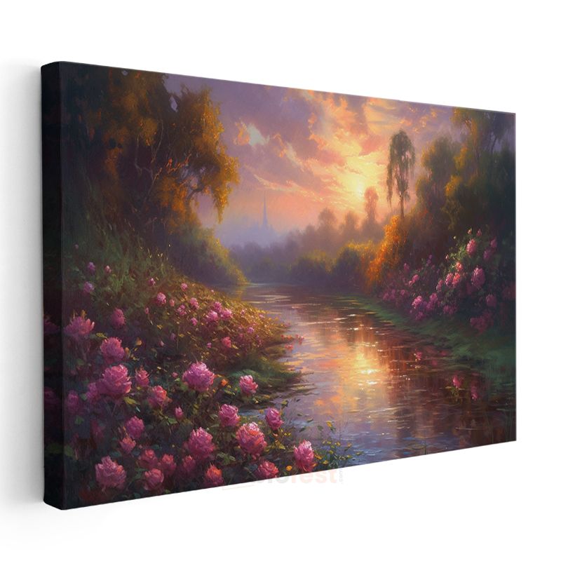 Çiçekli Nehir - Gün Batımında Pembe Çiçeklerle Bezeli Doğa Kanvas Tablo