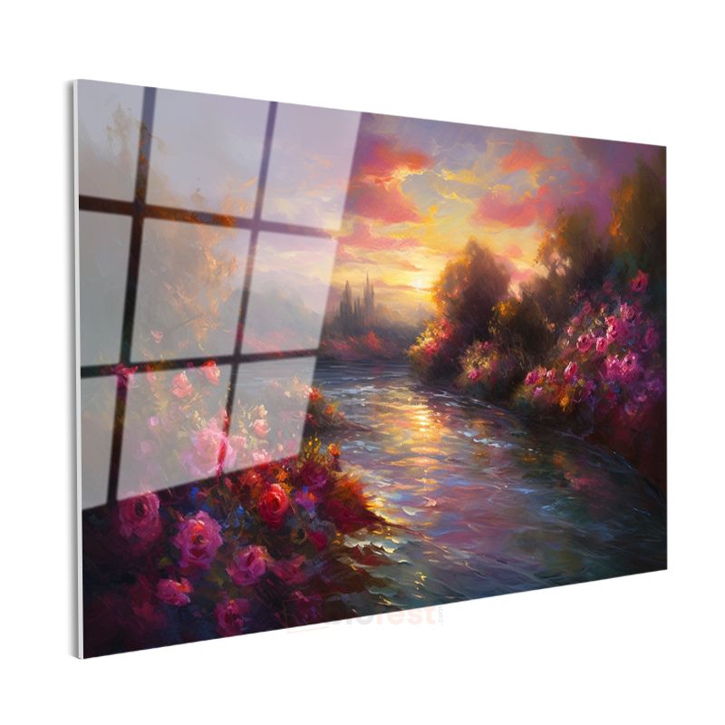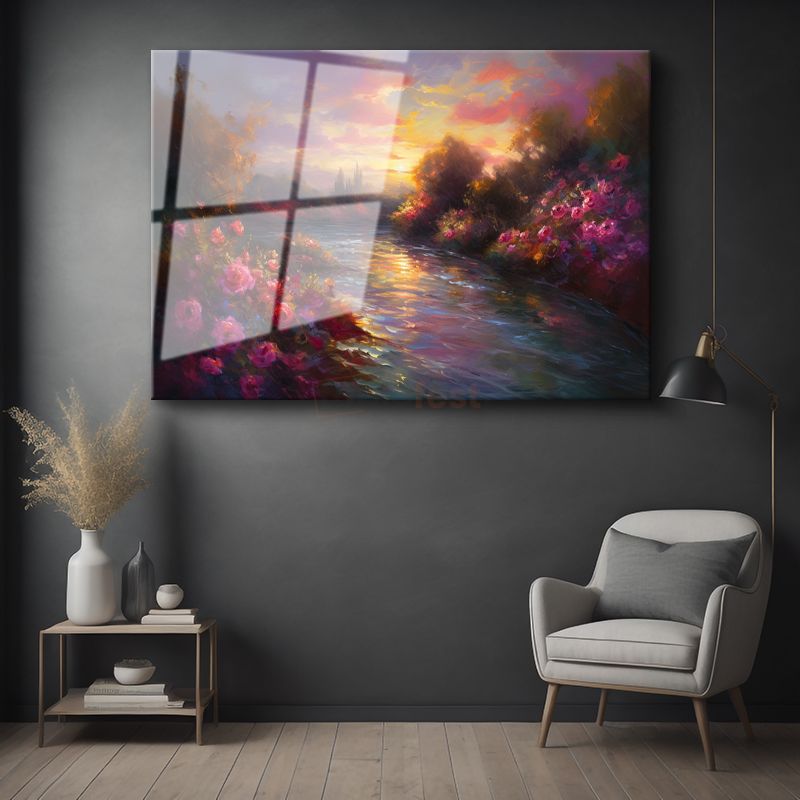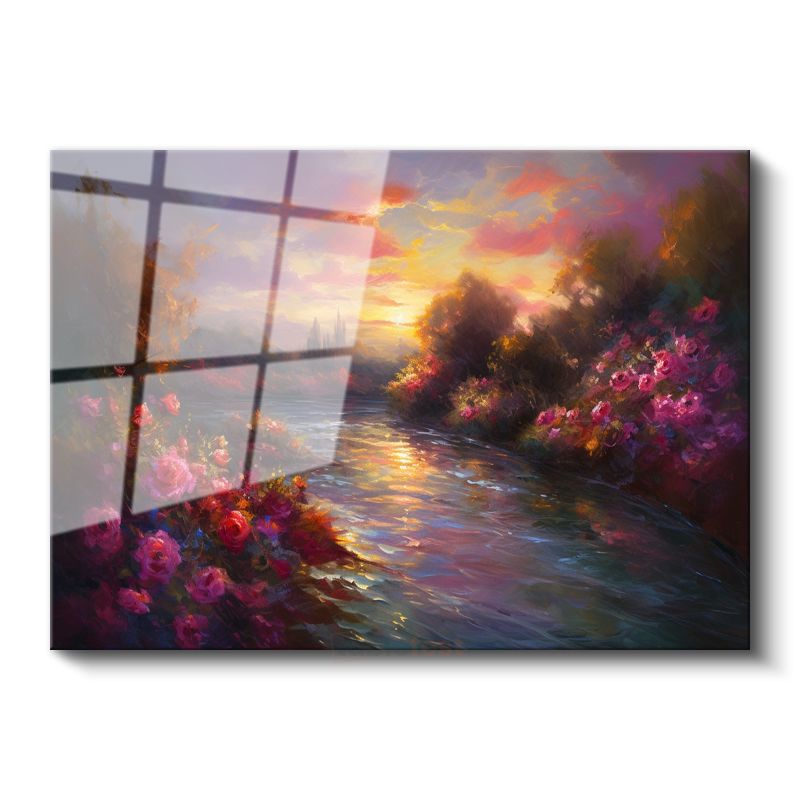 Çiçekli Nehir - Gün Batımında Pembe Güller Cam Tablo