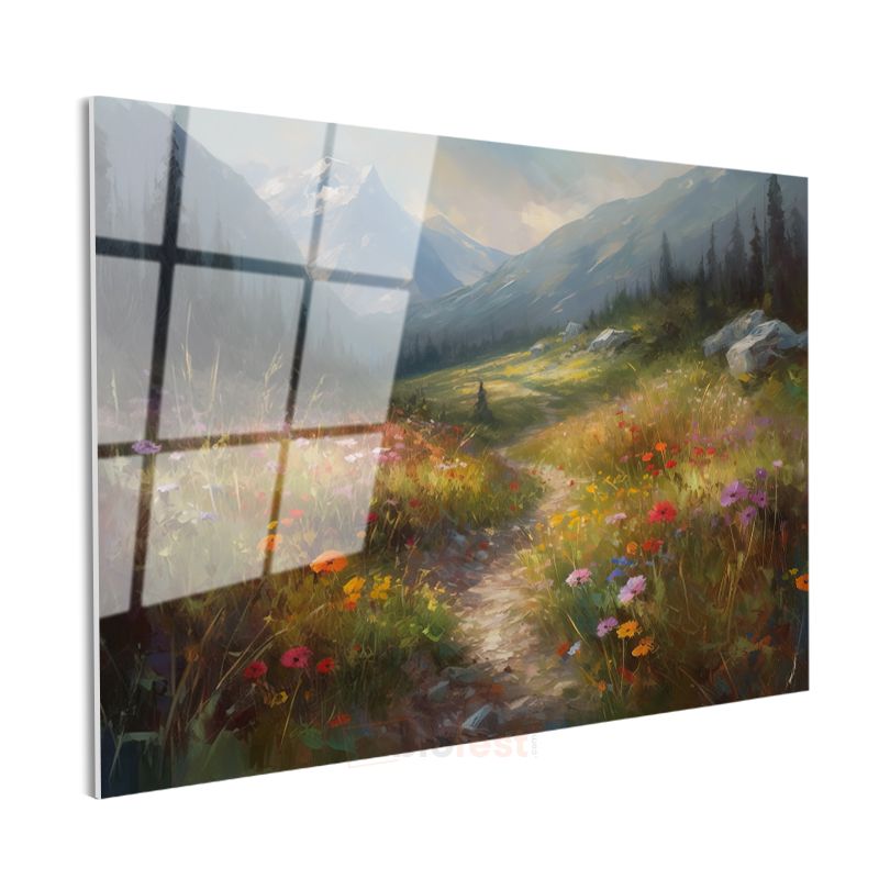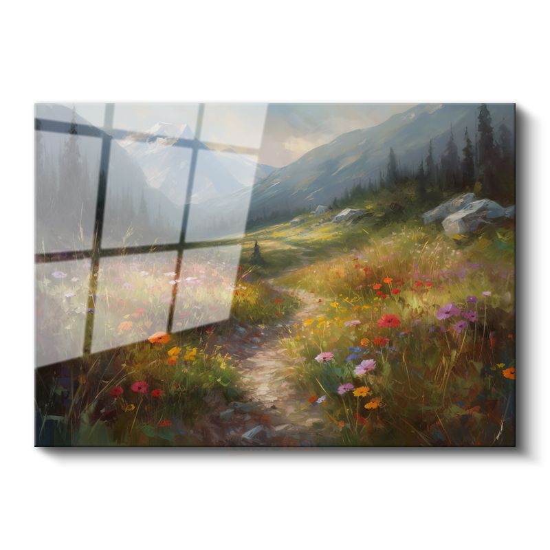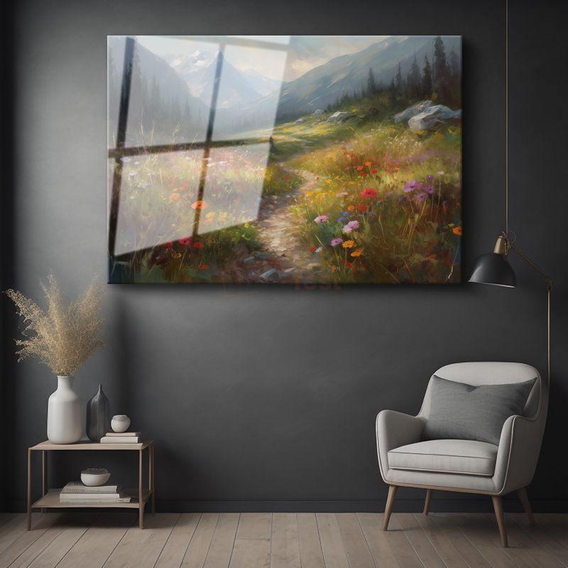 Çiçekli Patika - Dağ Eteklerinde Rengarenk Çayır Cam Tablo