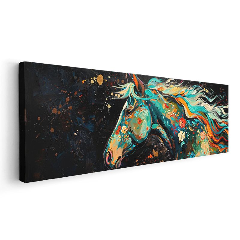 Çiçekli Rüya - Turkuaz ve Turuncu Tonlarında At Portresi Kanvas Tablo