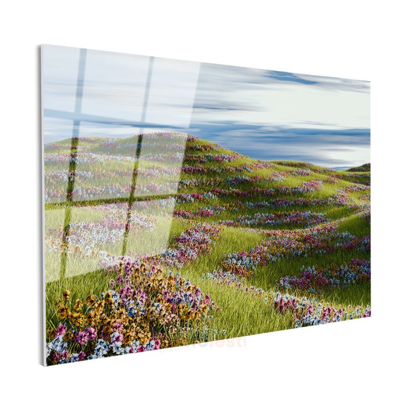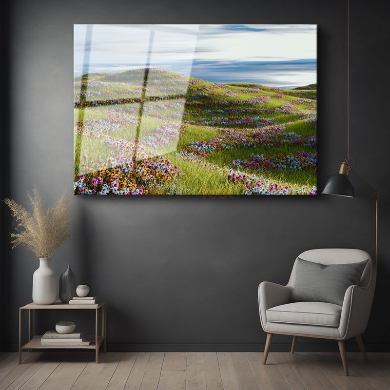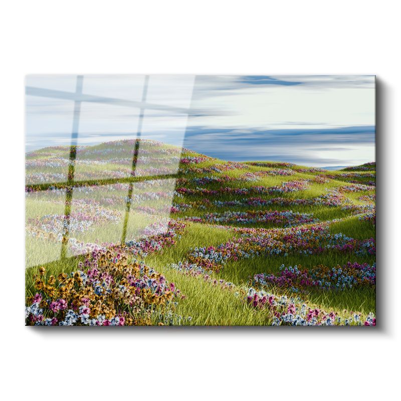 Çiçekli Tepeler - Renkli Vahşi Çiçeklerle Bezeli Yeşil Yamaçlar Cam Tablo