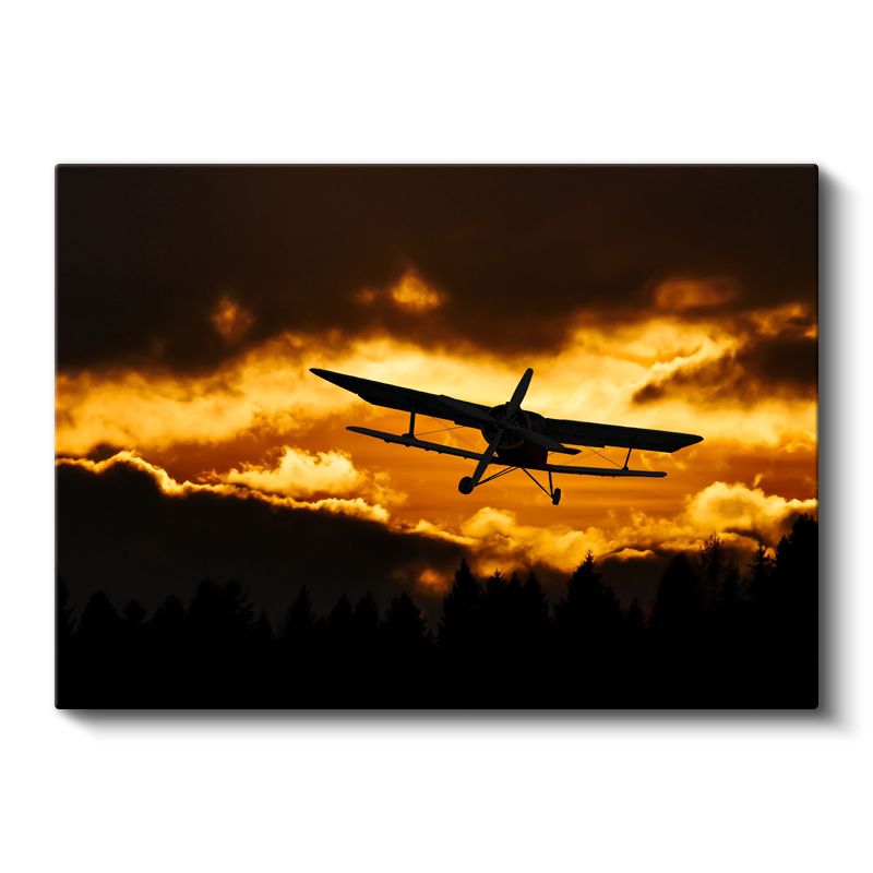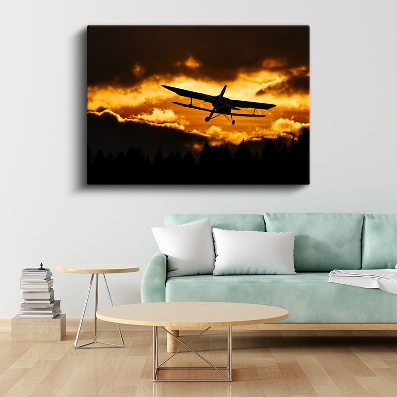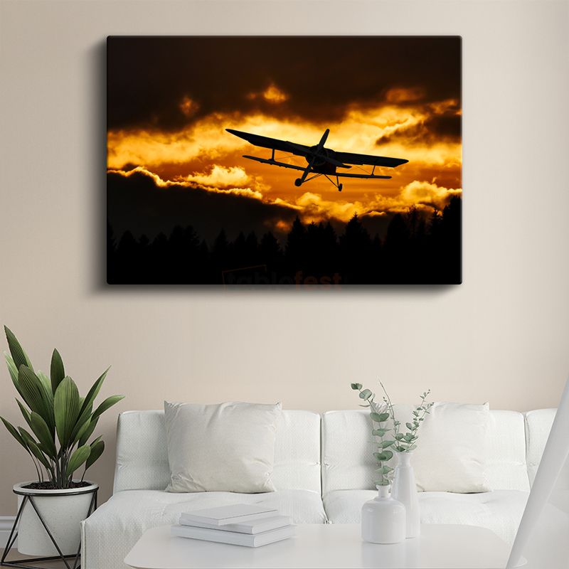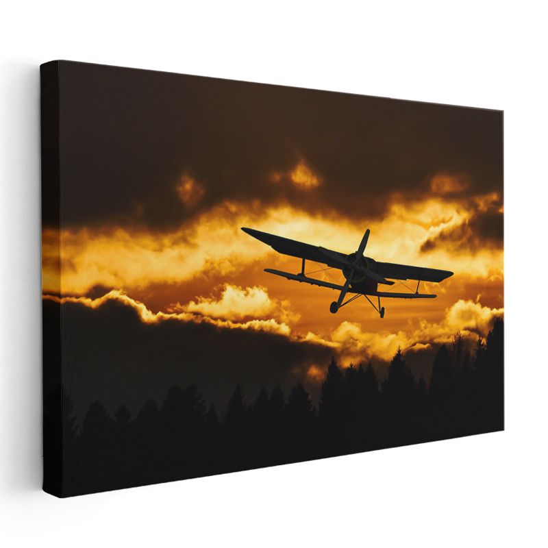 Çift Kanatlı Uçak - Altın Gökyüzünde Silüet Kanvas Tablo