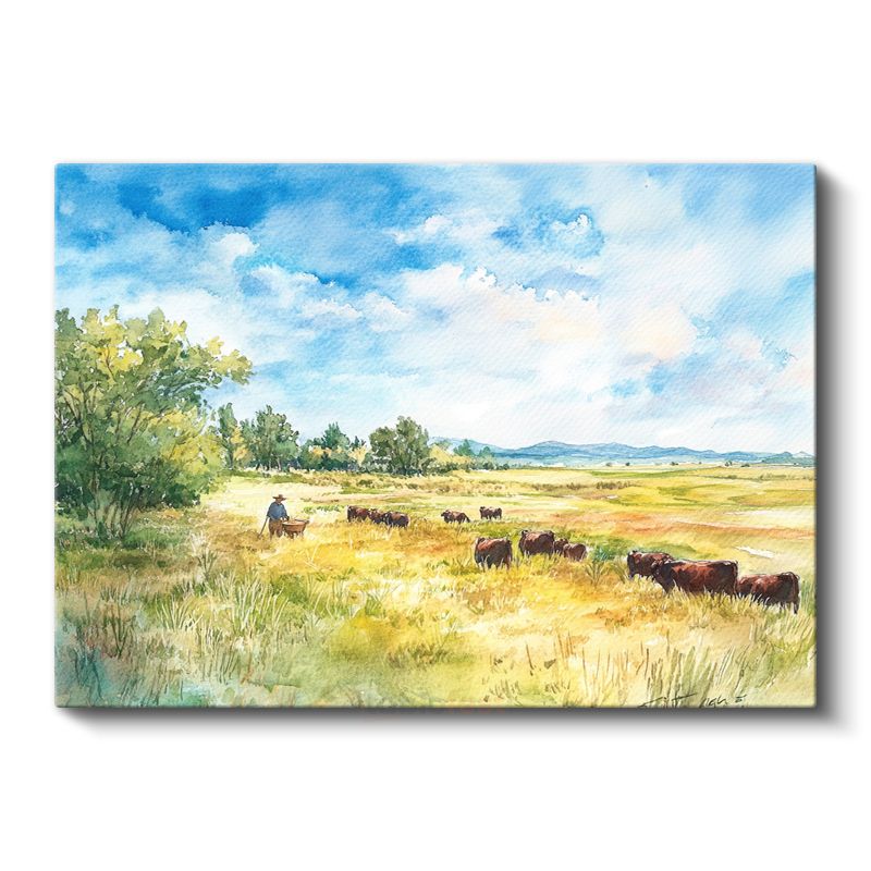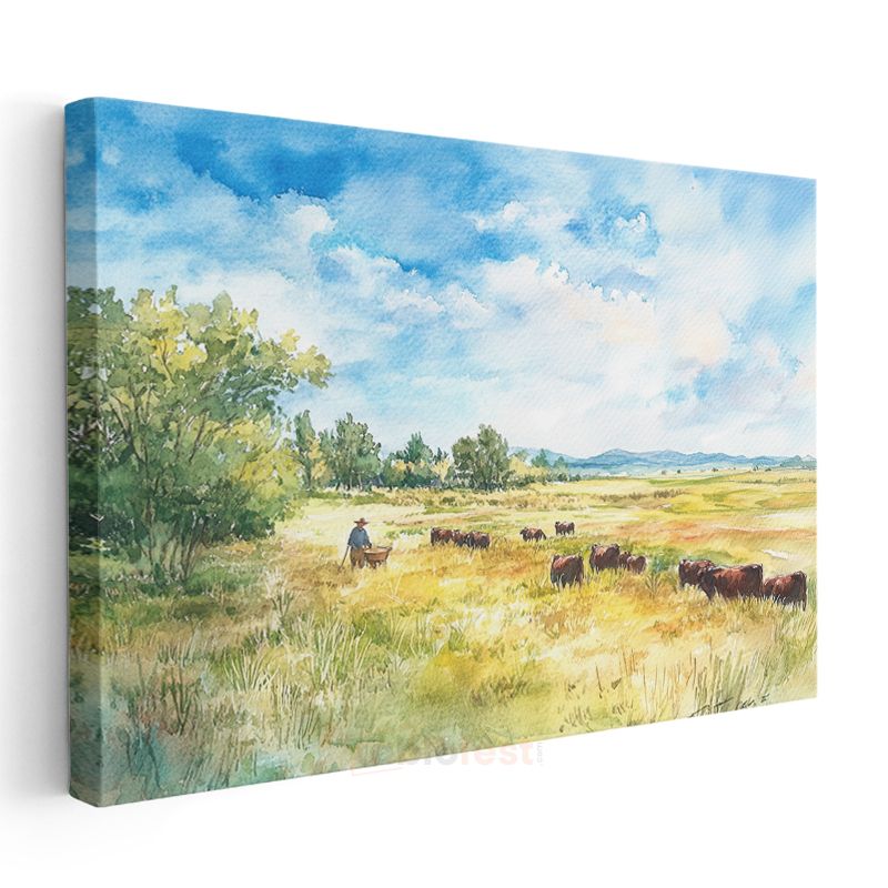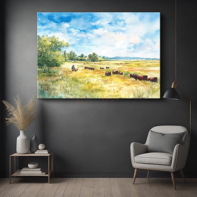 Çiftlik Manzarası - Altın Sarısı Çayırda Otlayan Sığırlar Kanvas Tablo