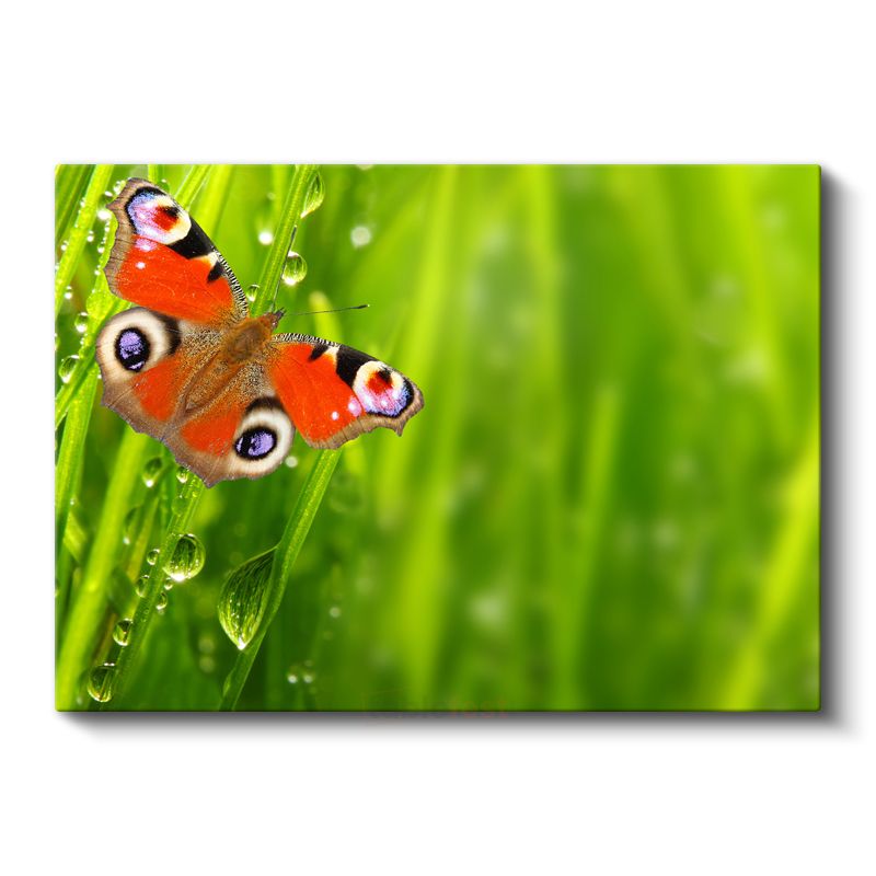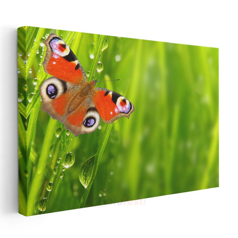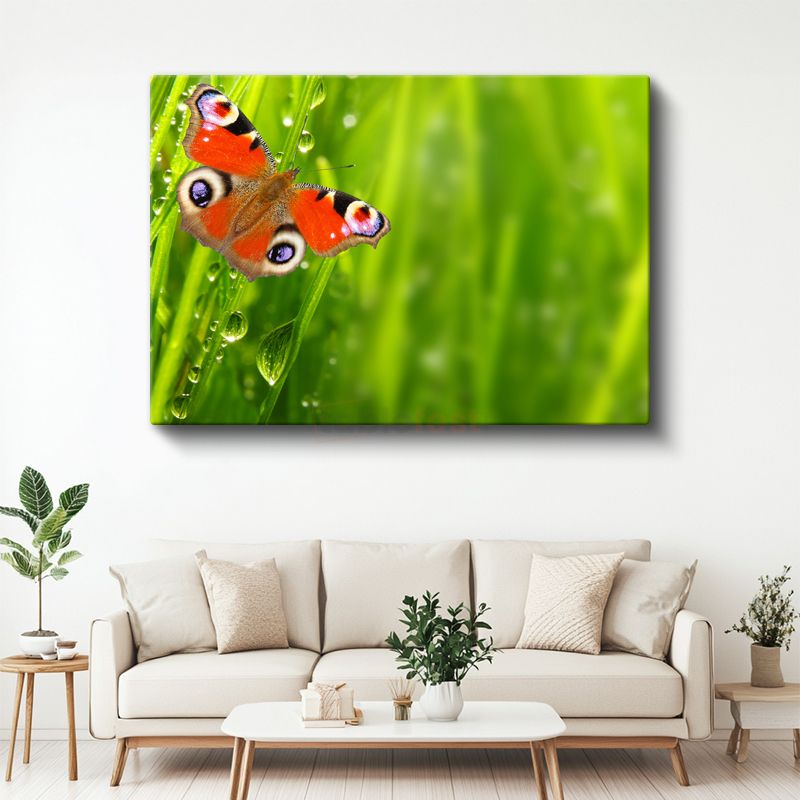 Çiy Damlalı Kelebek - Yeşil Çimende Turuncu Kanatlar Kanvas Tablo